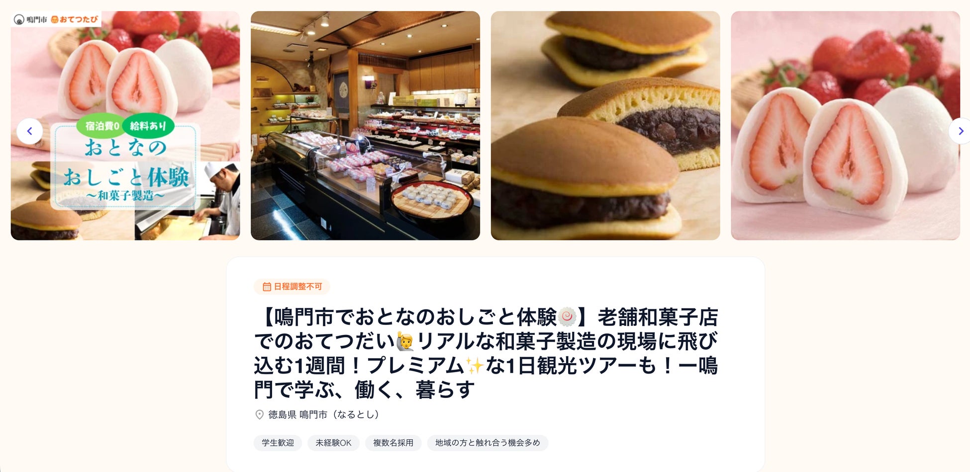 第2弾となる今回は、鳴門市の魅力である「食」を支える地場産業(和菓子製造・食品製造・水産加工)の3事業所で受け入れを行います。