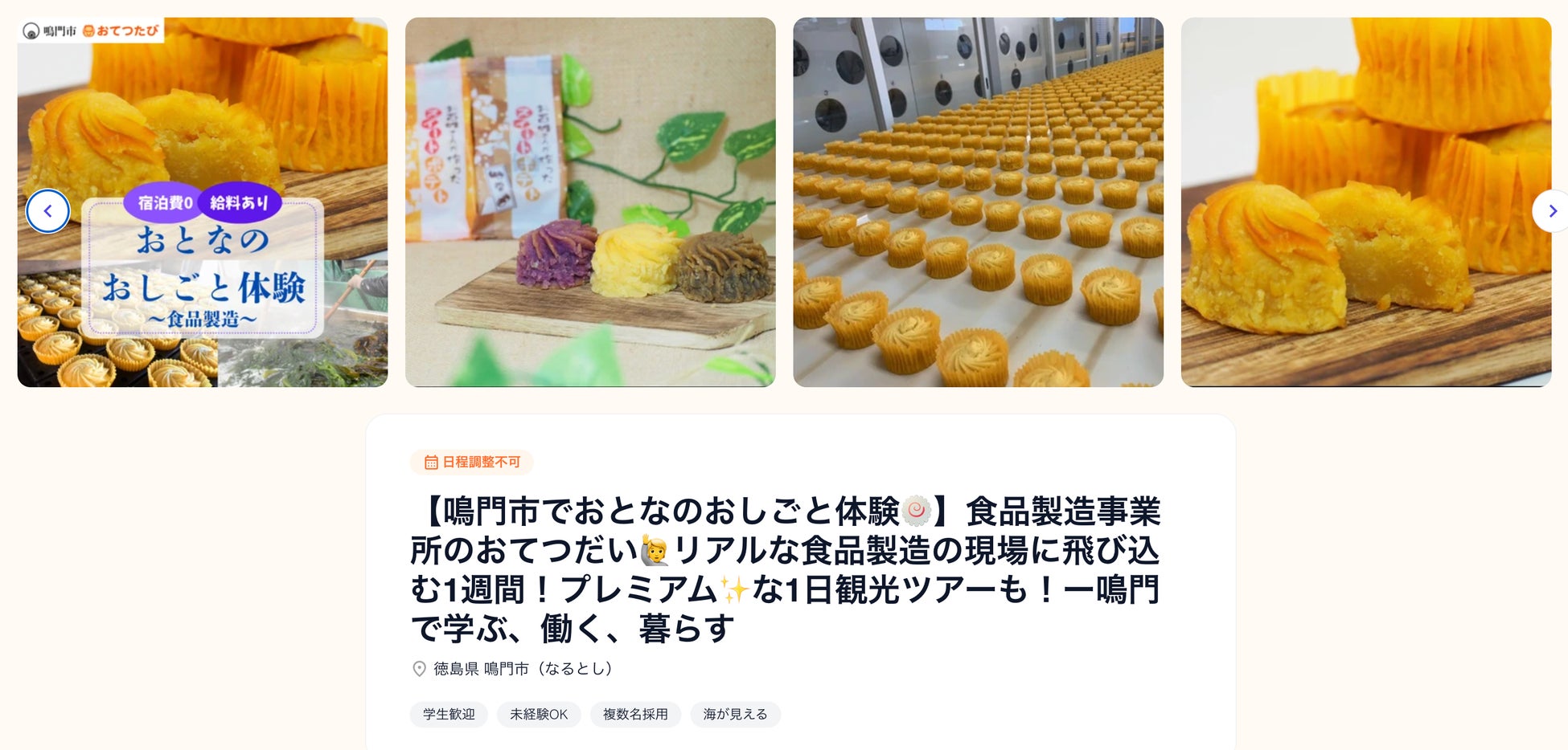 株式会社おてつたび(本社:東京都品川区、代表取締役CEO:永岡里菜、以下「おてつたび」)は、徳島県鳴門市と共に、移住交流の促進、関係人口の創出・拡大、人手不足の解消などに取り組んでいます。このたび、鳴門市との連携協定に基づく取り組みとして、UIJターン促進を目的とした“おとなのおしごと体験(インターンシップ)”第2弾を開始します。