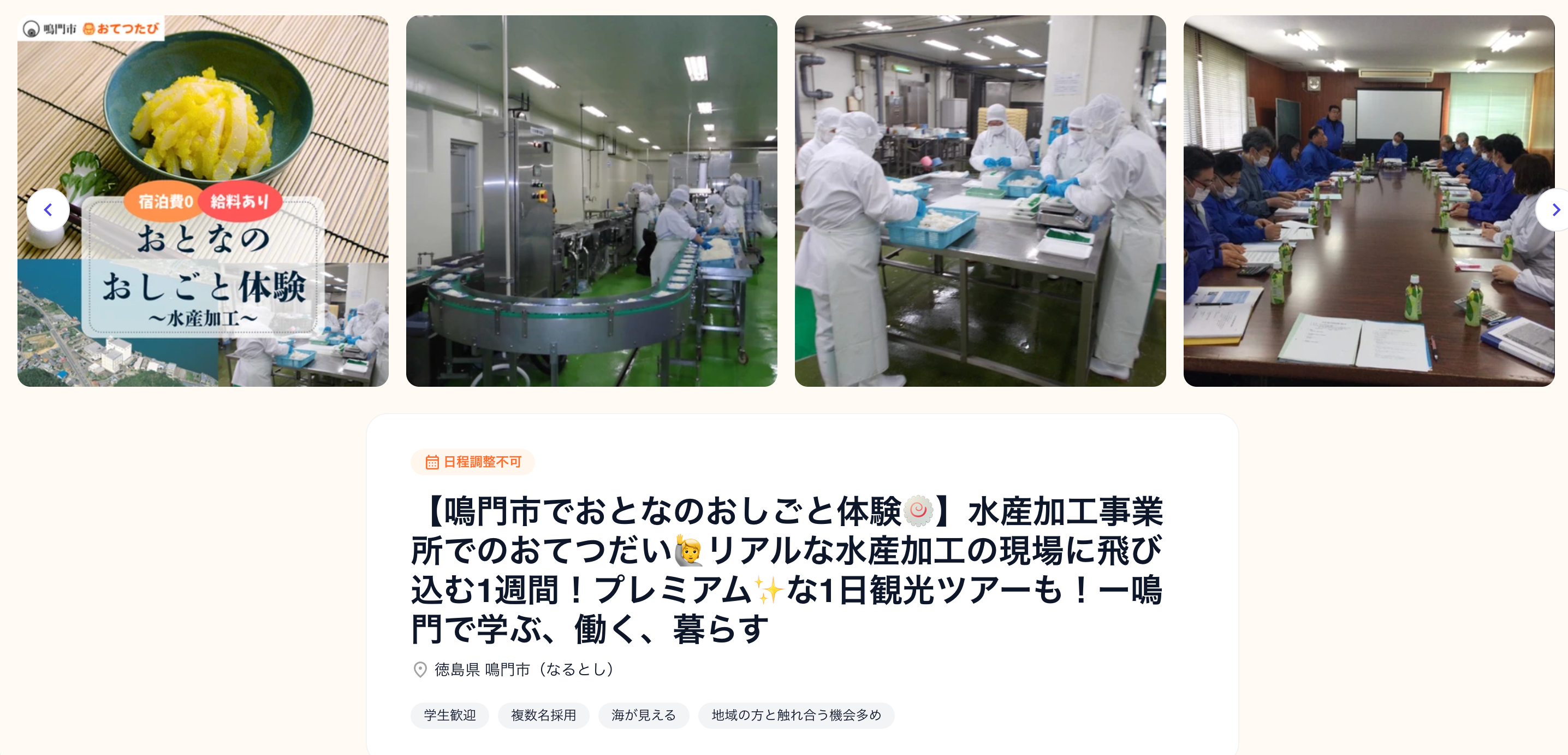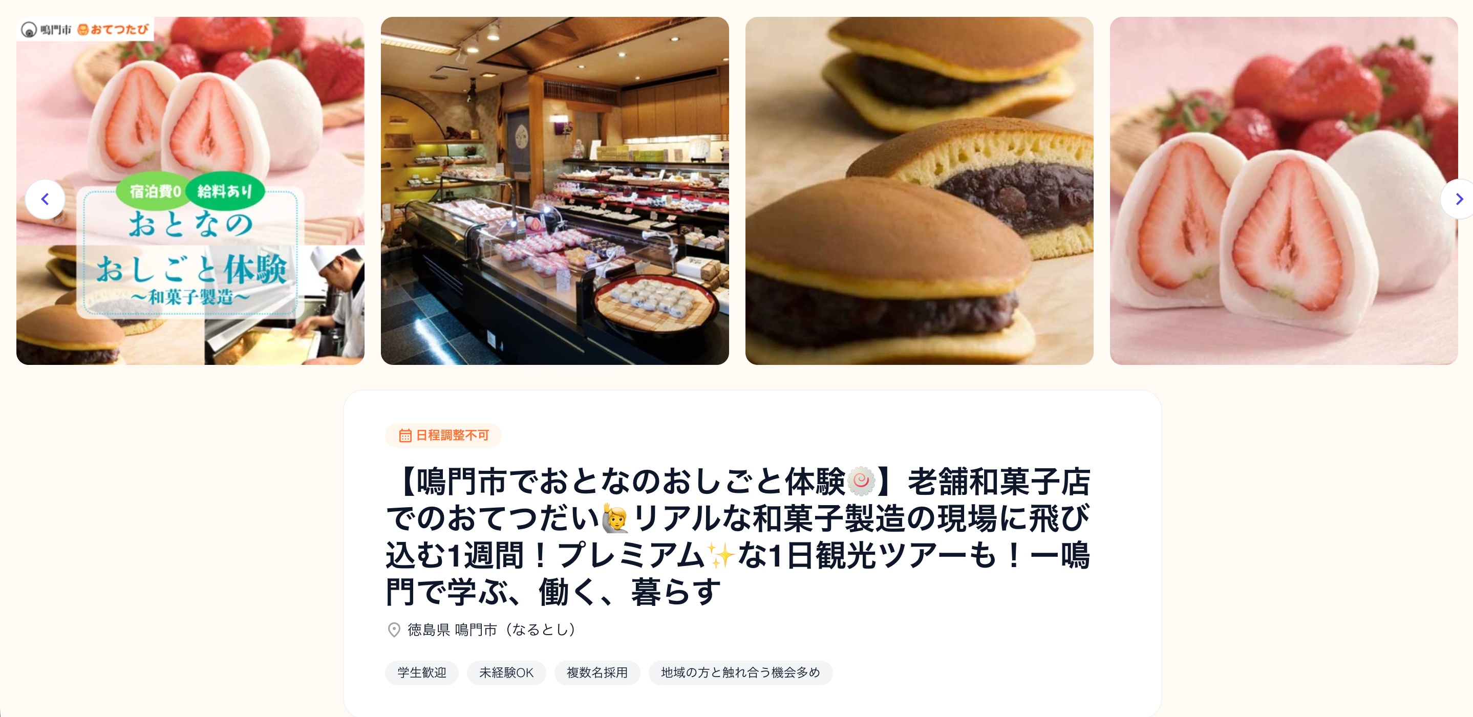 第2弾となる今回は、鳴門市の魅力である「食」を支える地場産業(和菓子製造・食品製造・水産加工)の3事業所で受け入れを行います。