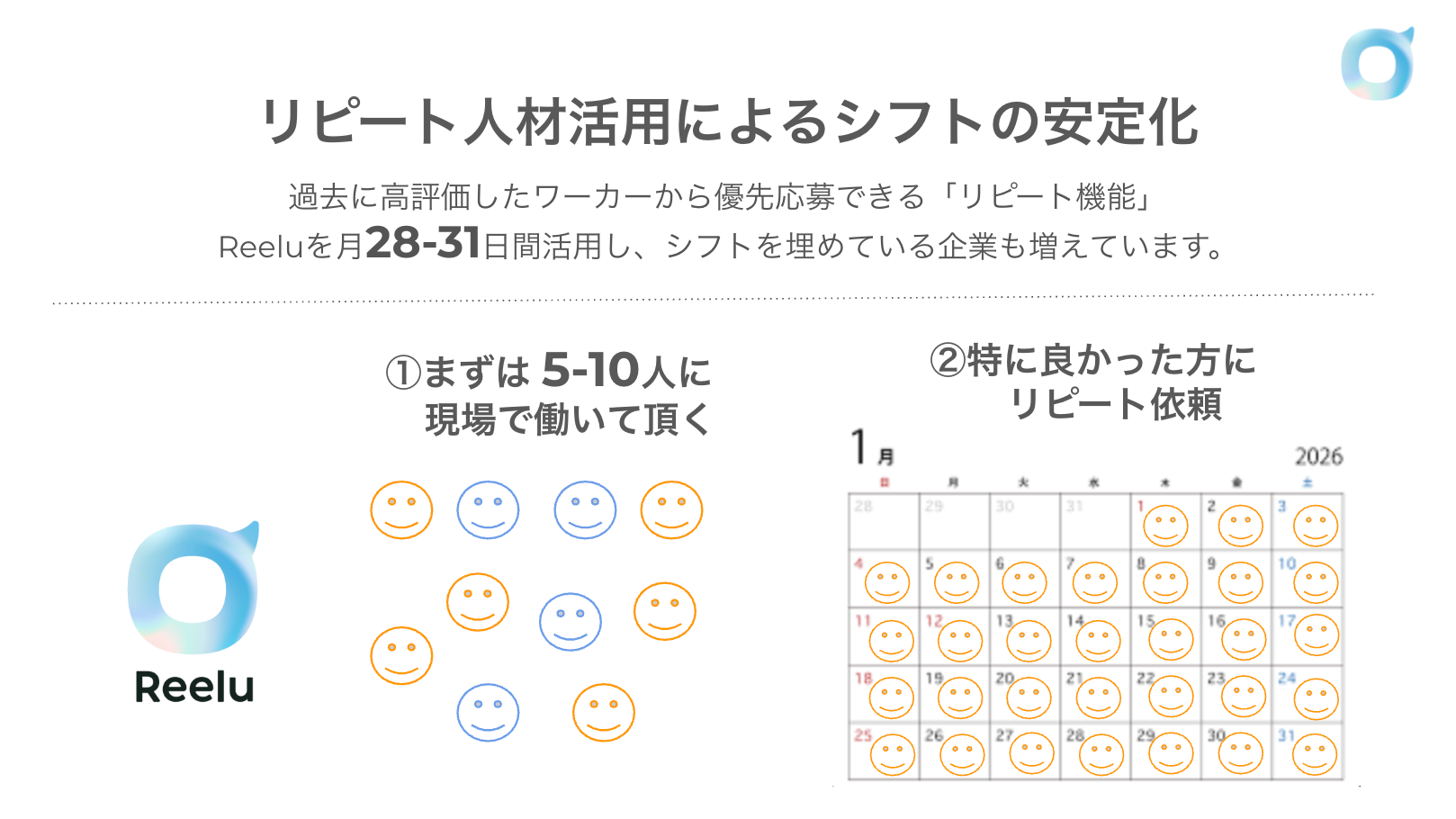 株式会社Reelu(本社:東京都、代表取締役:今野珠優、以下Reelu:リール)は、導入企業の皆様が「またお願いしたい」と感じたワーカーに対し、指名して継続的に依頼をすることができる「リピート指名プラン」の提供を開始しました。業務現場の課題として多い、シフトの不安定さや繁忙期の人員確保に対し、同一人材への継続依頼という選択肢を提供することで、企業の運用負担を軽減し、現場品質の安定に貢献します。
