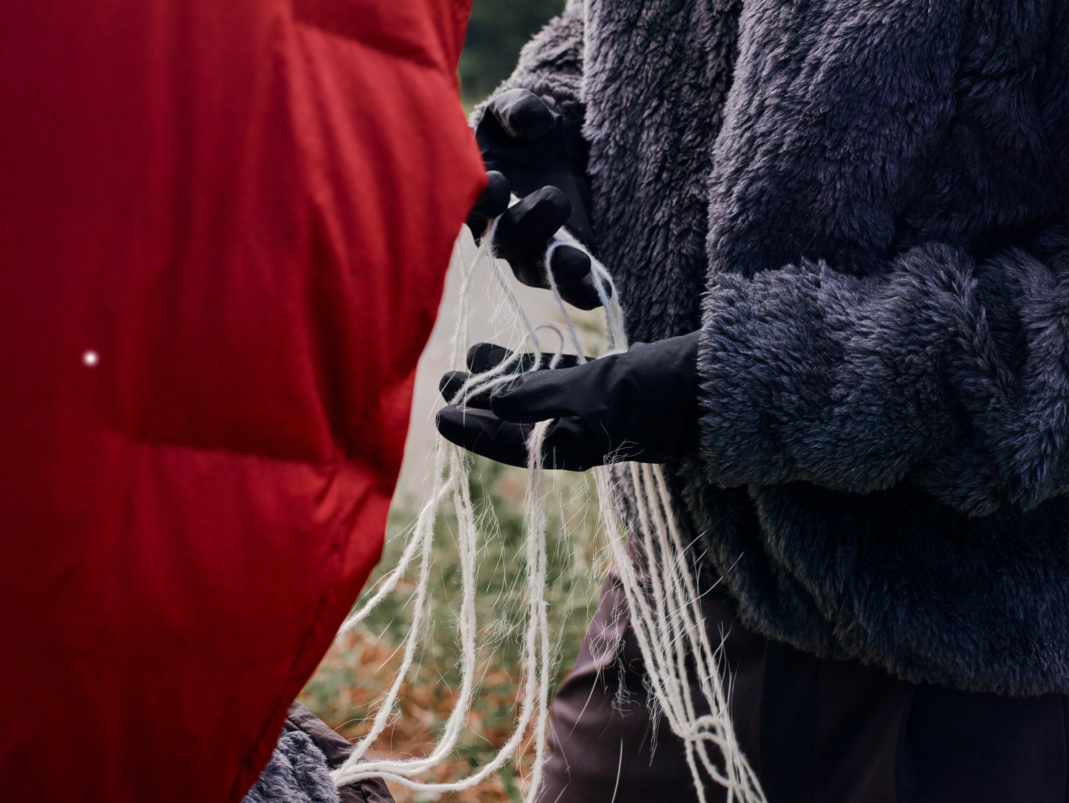 J.L-A.Lの独創性と最新技術が融合した「Fleece Jacket」は、衣服の未来を垣間見せる象徴的なプロダクトです。本製品の核となる、革新的な素材には、植物由来のバイオマスプラスチック「PlaX」のベースに、Spiber株式会社(本社:山形県鶴岡市/取締役兼代表執行役:関山和秀/以下、Spiber)が開発したプロテイン繊維素材「Brewed Protein™」、そしてシルクファーを組み合わせた次世代ボアフリースの素材が採用されています。J.L-A.Lの独創的なパネル構造によるデザインと、最先端の素材が持つポテンシャルを最大限に引き出すため、ゴールドウインとSynfluxが共同開発する生産システム「SYN-GRID」が導入されました。型紙の最適化により、複雑で独創的なデザインにもかかわらず、生産時の生地廃棄物を約50%に抑えることに成功。技術革新と高度なクリエイティブを融合し、持続可能な衣服の未来の在り方を提案します。