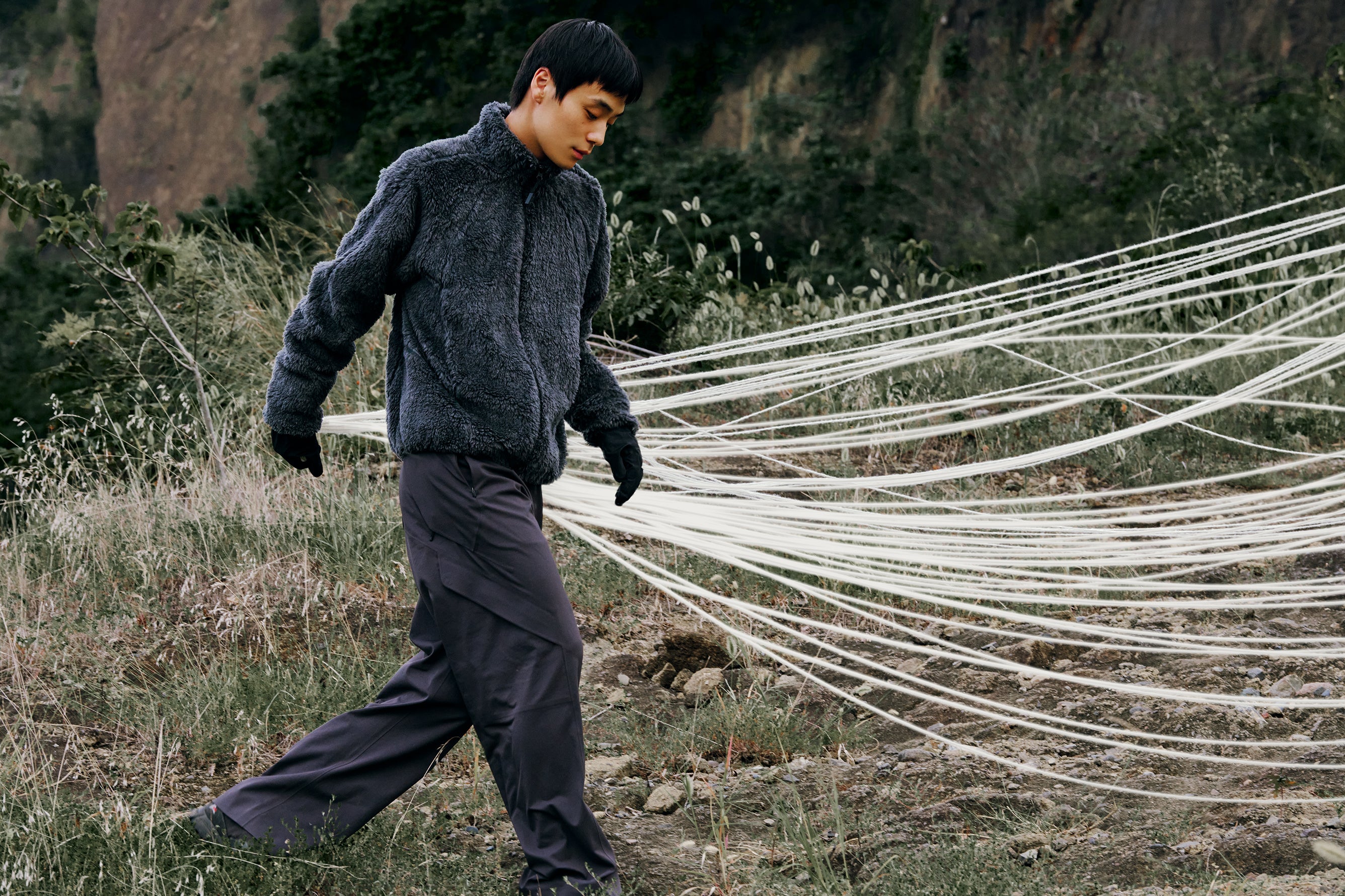 デザイン面では、_J.L-A.L_が持つ独自のカッティング技術による造形や、素材・テクノロジーに対するユニークなアプローチがなされています。表面のステッチや生地の切り替えが途中で消えていく独創的なデザインが施され、フード周りのシャーリングやミニマルな袖口など、テクニカルウェアとしての品質と機能性が、抑制された美学として表現されています。_J.L-A.L_は、職人技と技術革新との対話を通して、シグネチャーであるパネル構築を定義し、衣服の未来を垣間見ることができるプロダクトを表現しました。