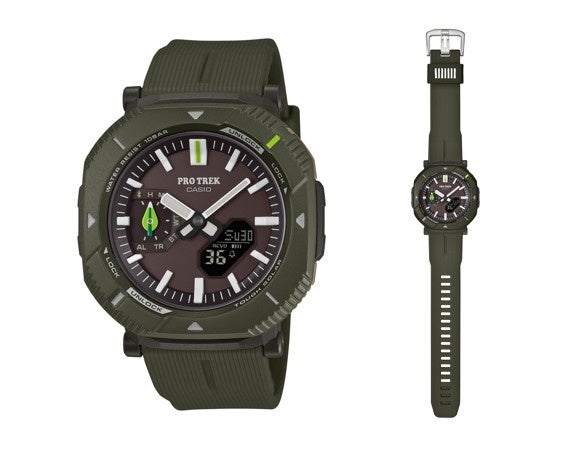 今回ご案内する『PRJ-B001NJ』は、葉っぱを手にした「アース&ピクルス ビーンドール」をモチーフに、里山の豊かな自然を守りたいという想いと安全なアウトドアライフへの想いをデザインに落とし込んだモデルです。深みのあるダークグリーンをベースに、裏蓋、12時位置のインデックス、ボタン、小針には、明るくフレッシュなグリーンカラーを配色。デザイン性を保ちながら腕元に自然と馴染む仕上がりです。