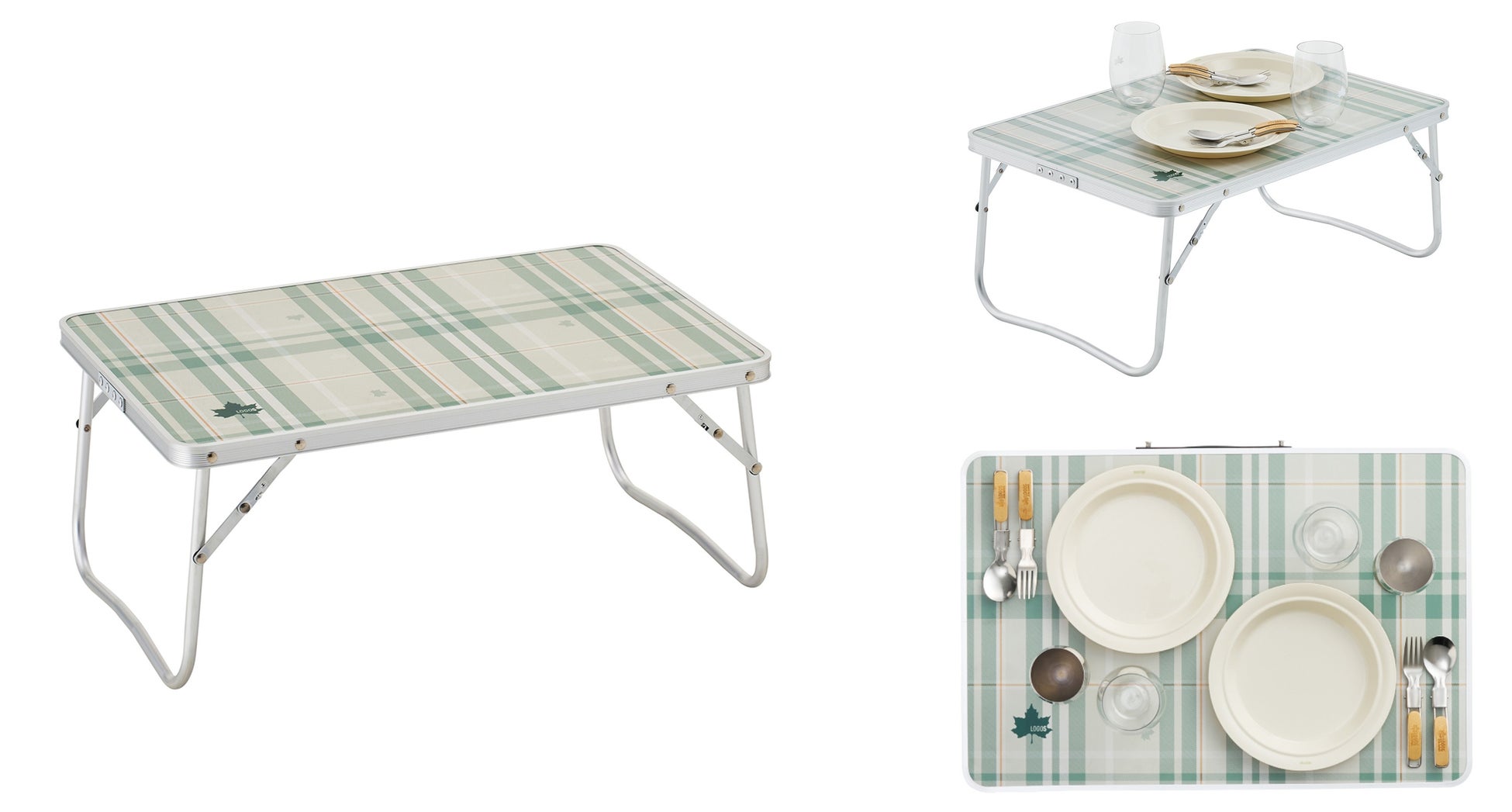 また、「ソリッドローテーブル 6040」は、「ソリッドテーブル 6040」と同じサイズの1枚天板仕様で、高さが25cmのローテーブルです。ローチェアやレジャーシートとも相性が良く、ピクニックやキャンプなどの屋外はもちろん、屋内でも気軽に使えます。重さは約1.0kgと非常に軽量で、収納時は厚さ約2.2cmのスリムサイズになり、持ち運びや保管もラクラクです。