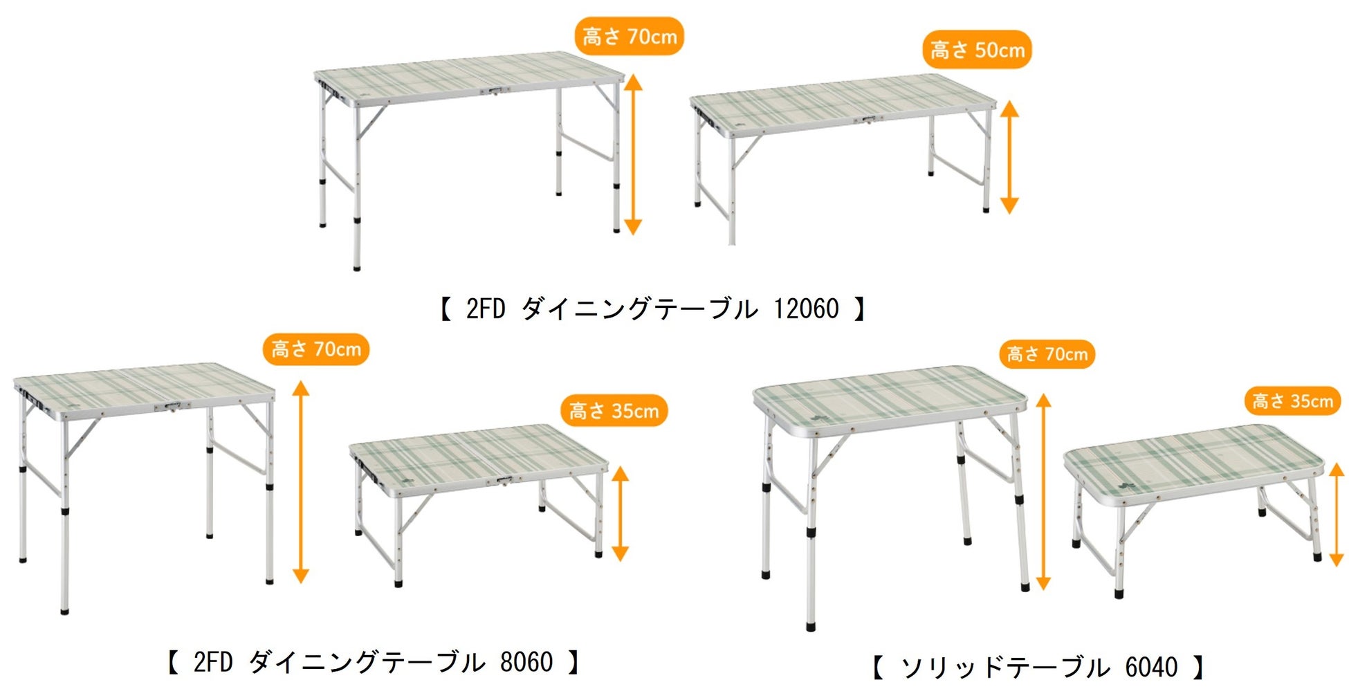 「2FD ダイニングテーブル 12060」「2FD ダイニングテーブル 8060」「ソリッドテーブル 6040」は、2段階の高さ調節が可能。高さを切り替えることで、子どもから大人まで快適に使用でき、チェアを使ったダイニングスタイルからロースタイルでのくつろぎシーンまで、スタイルに合わせたキャンプが楽しめる。