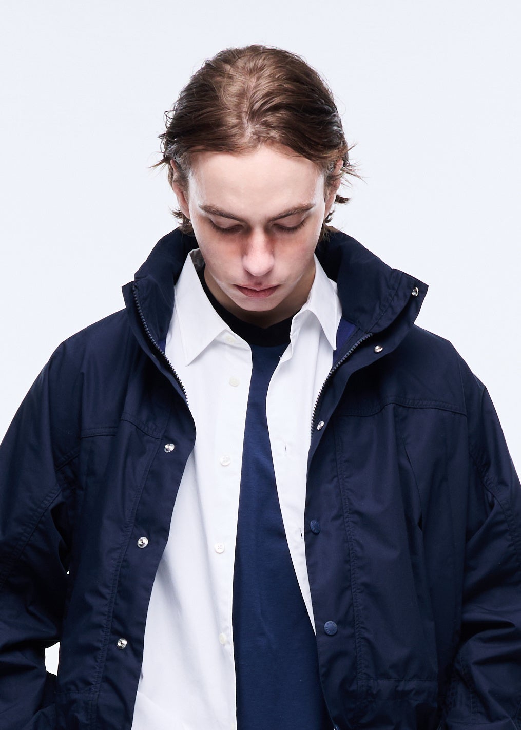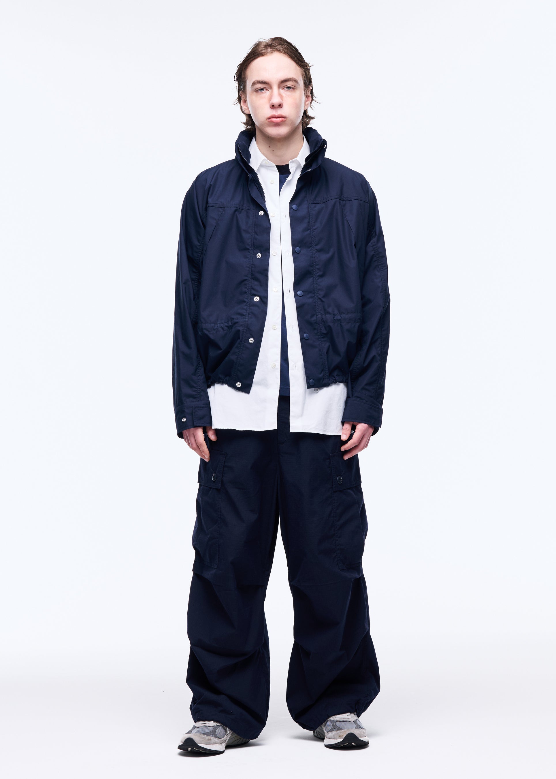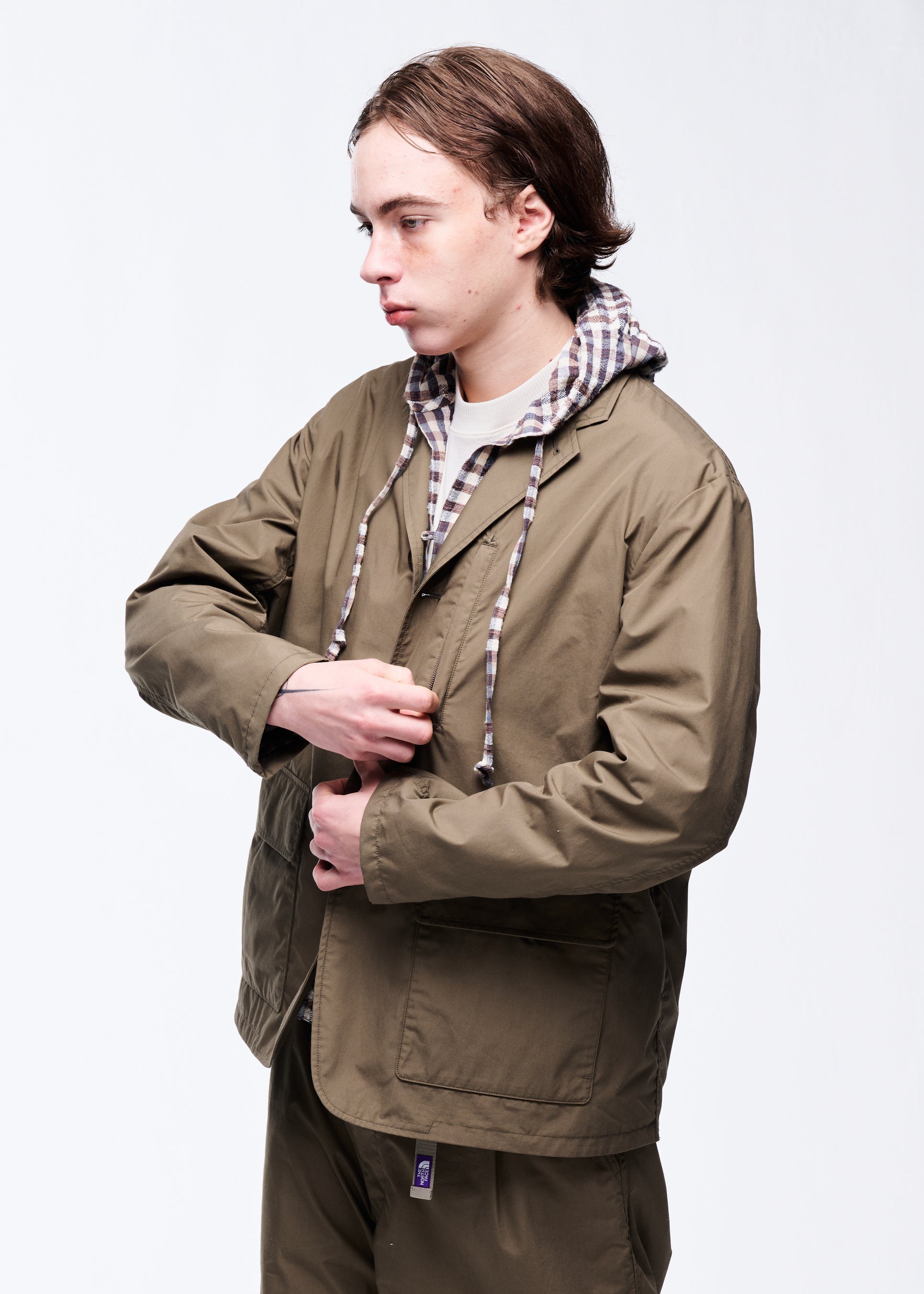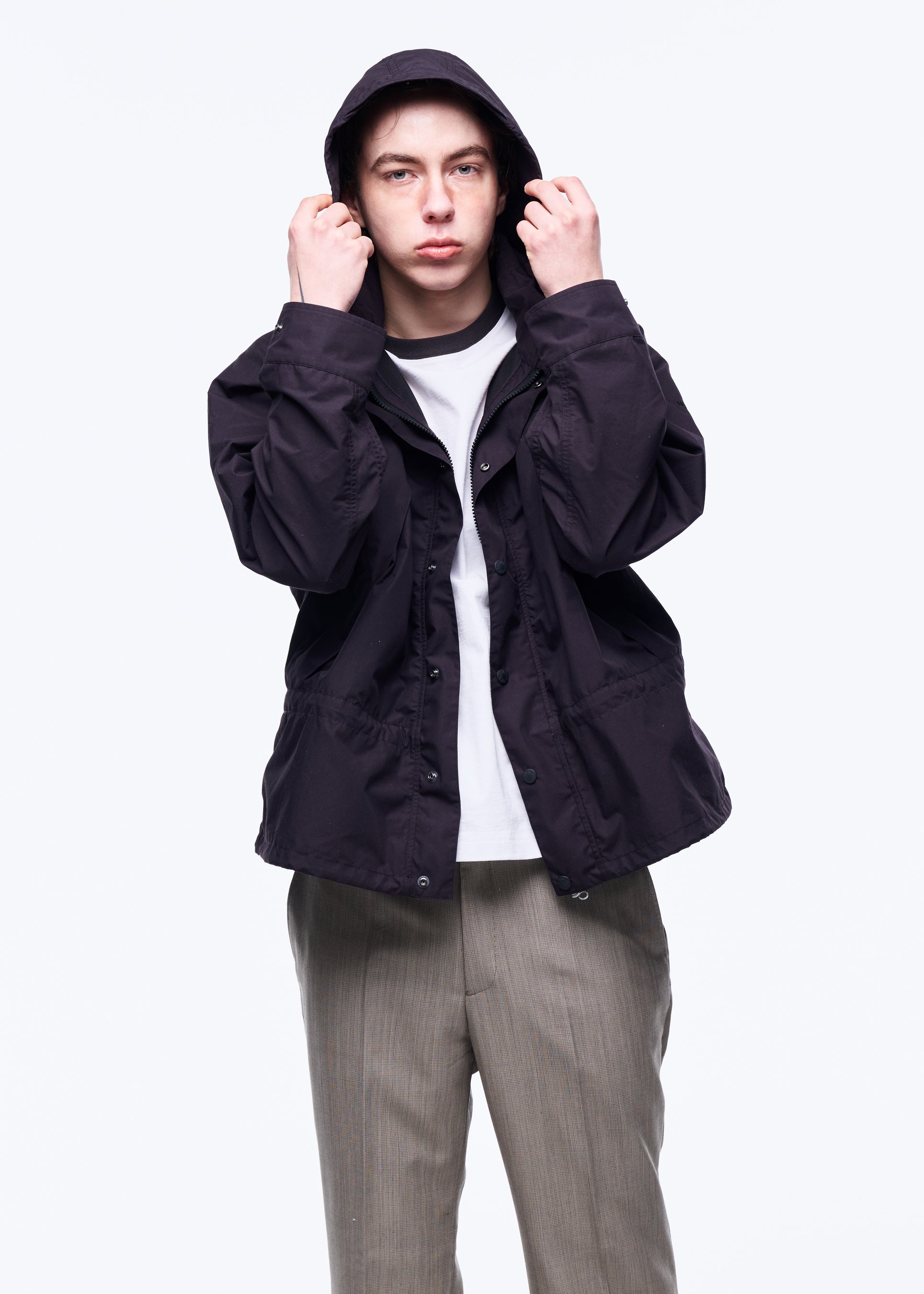 フードイン仕様のスタンドカラーやドローコード、同色刺繍など、主張しすぎない機能美が光る一着。