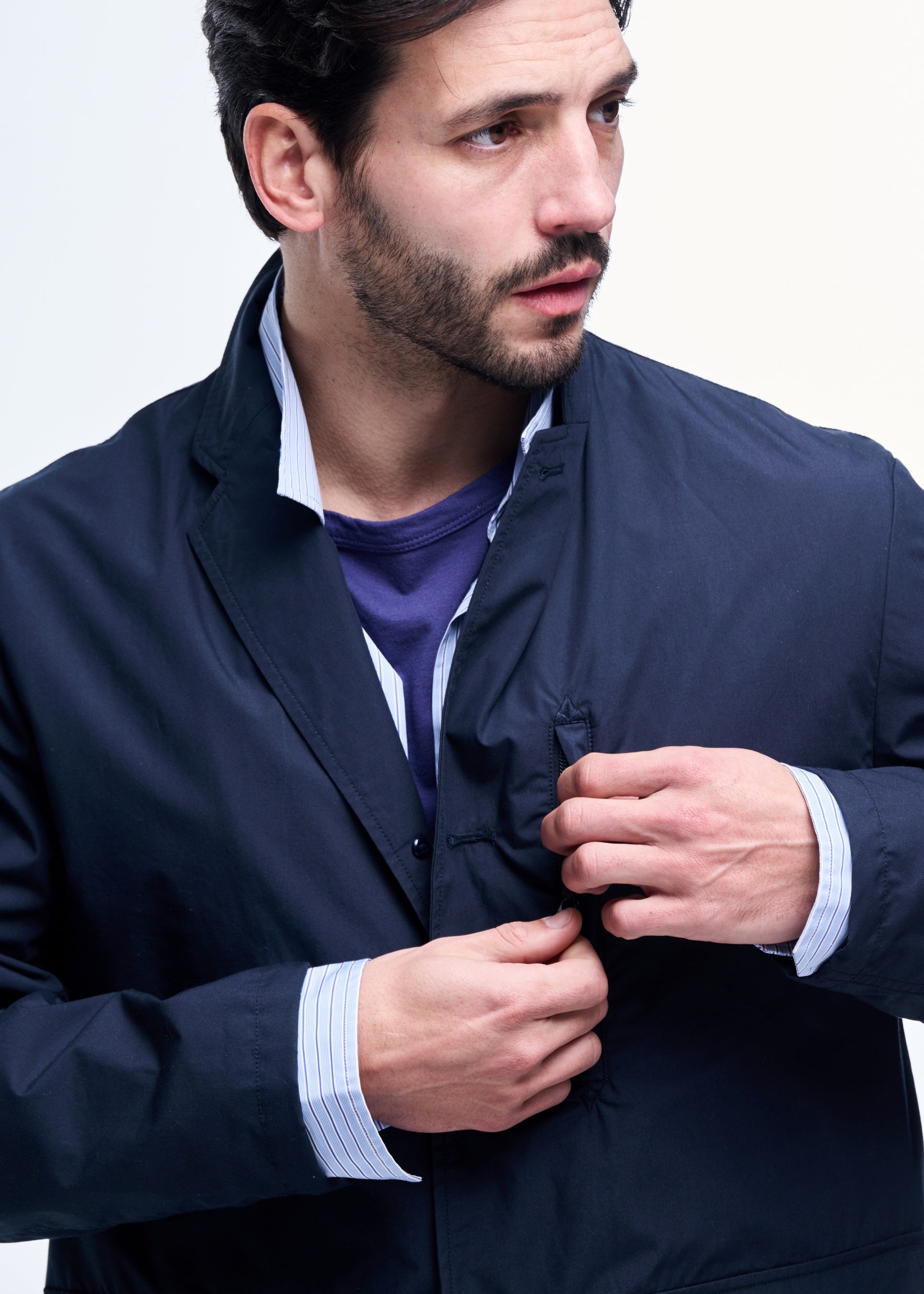 本カプセルコレクションを象徴するミッドウェイト65/35ベイヘッドクロスを使用したバークレージャケット。知性とラフさを併せ持つ、実用的で肩の力の抜けた空気感に。多機能ポケットを備えつつ、カラーはトラッドな匂いを佇ませながらも都会的な印象に仕上げた。