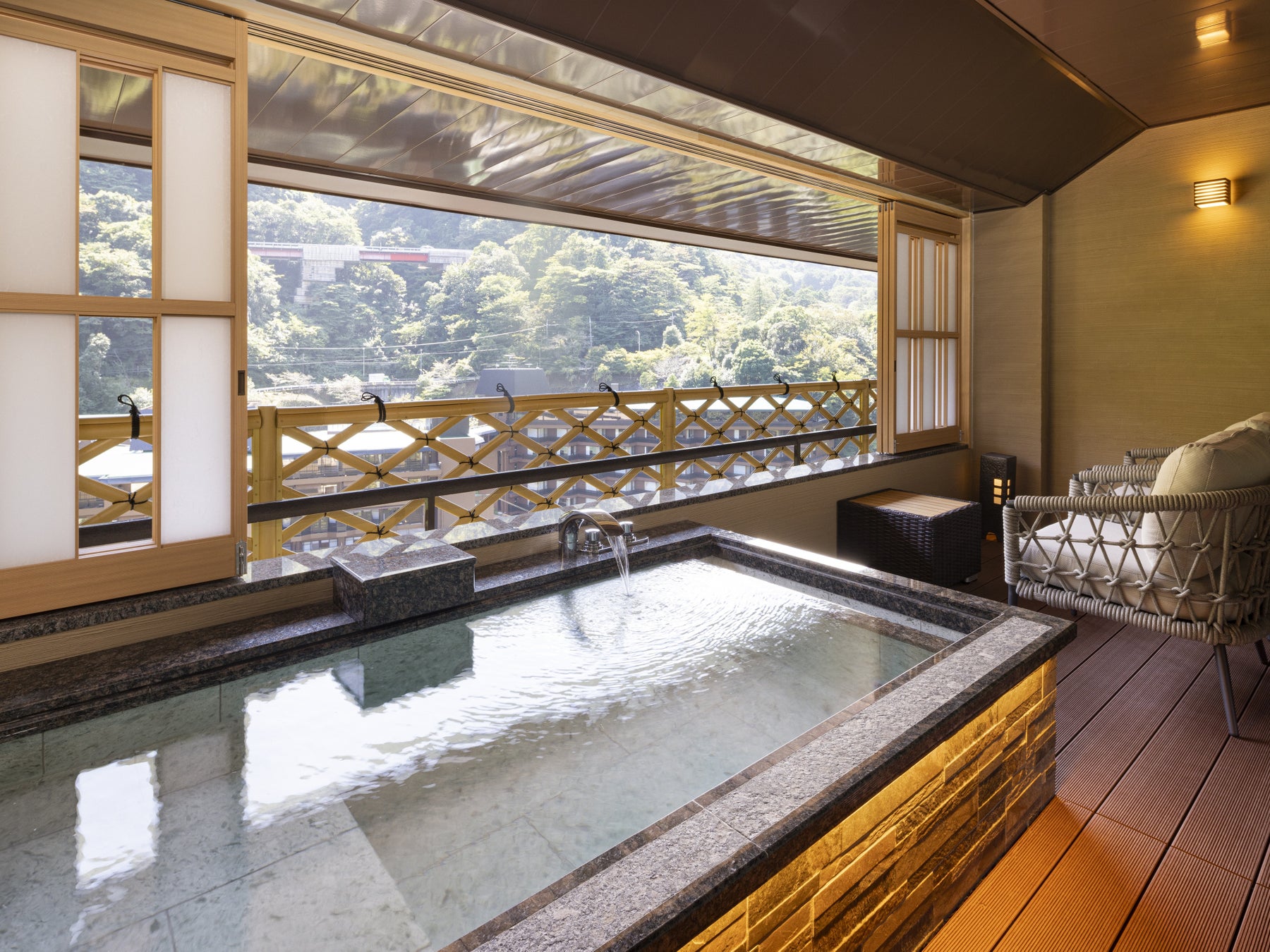 また、屋外テラスの足湯は屋根を撤去し、二子山をはじめとする箱根の山々を望む、より自然を身近に感じられる設えに刷新しています。