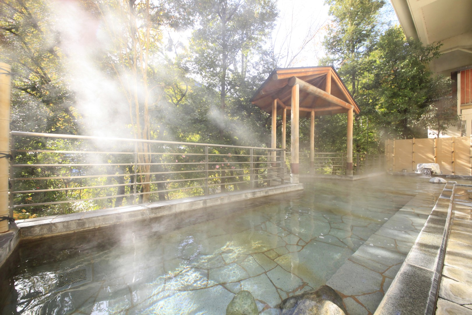 昼は爽やかな山景色、夜はライトアップされた幻想的な雰囲気の中で、箱根の自然と温泉のぬくもりをお楽しみいただけます。