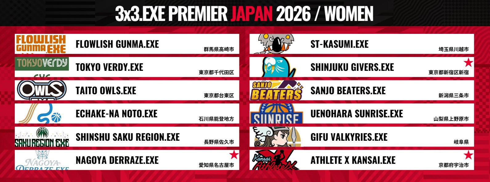 『3×3.EXE PREMIER 2026 JAPAN』の男子カテゴリーには、日本国内で5チーム、シンガポールから 初めて1 チームが参戦します。また、女子カテゴリーには3チームが新加盟し、昨シーズンの全9チームから全12チームに拡大いたしました。男女ともにより熾烈な戦いが予想される2026シーズンに、ぜひご注目ください。