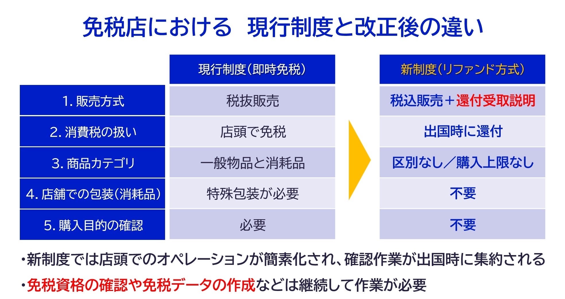 1950年の免税制度創設以来、最大の制度変更となる今回の改正では、従来の「店頭で消費税を差し引いて販売する方式(即時免税)」が廃止され、「購入者が買物時はいったん税込価格で支払い、出国時に空港等で確認後に返金を受けるリファンド方式型(還付方式)」へと完全移行します。