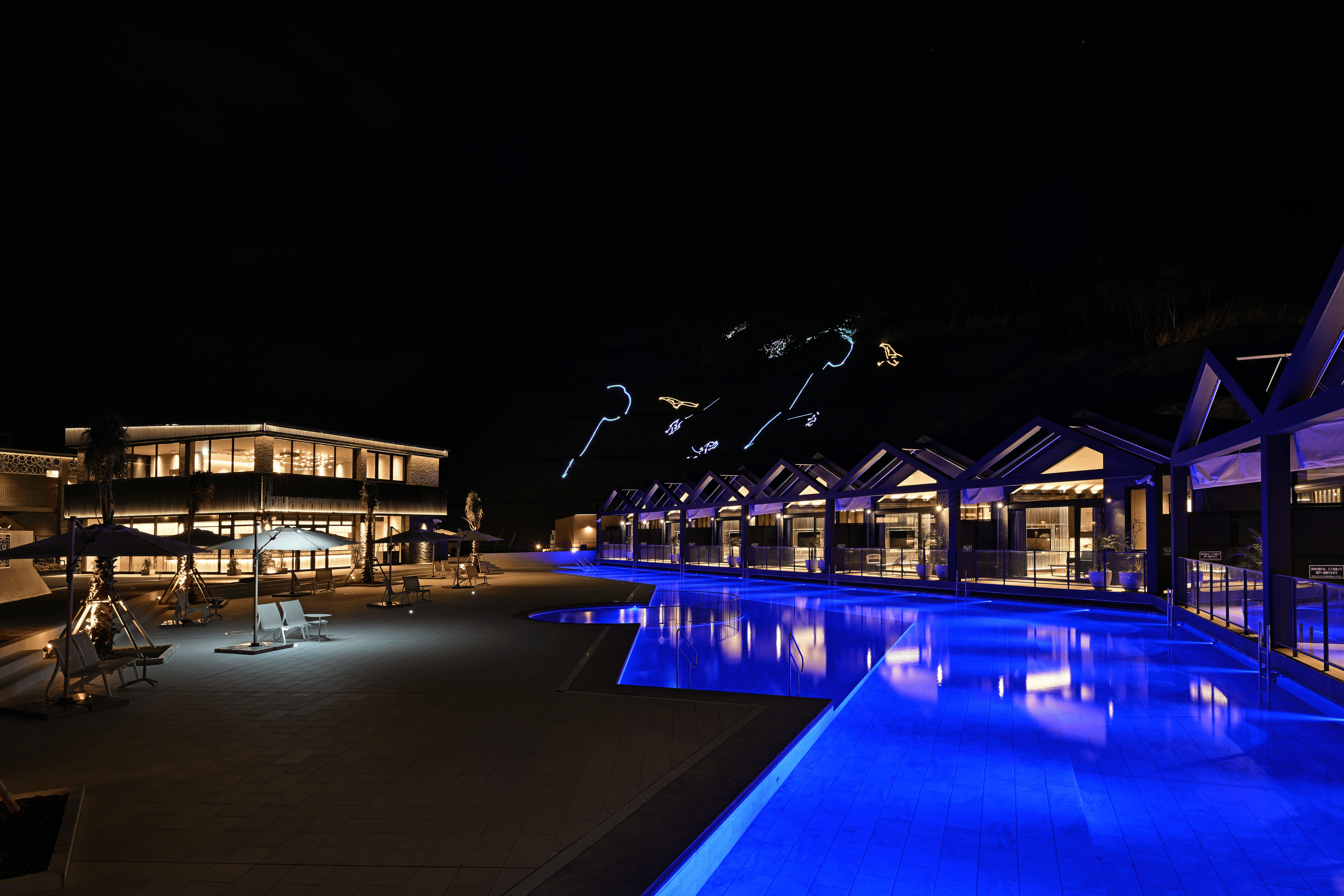 白浜の海と山に抱かれたロケーションのもと、温泉に加え、南紀白浜ならではの食材を使用した料理や、広大な敷地を活用した野外演奏・レーザーマッピングショー、プールサイドのバレルサウナなど、多彩なアクティビティをお楽しみいただけるオールインクルーシブが魅力となっています。