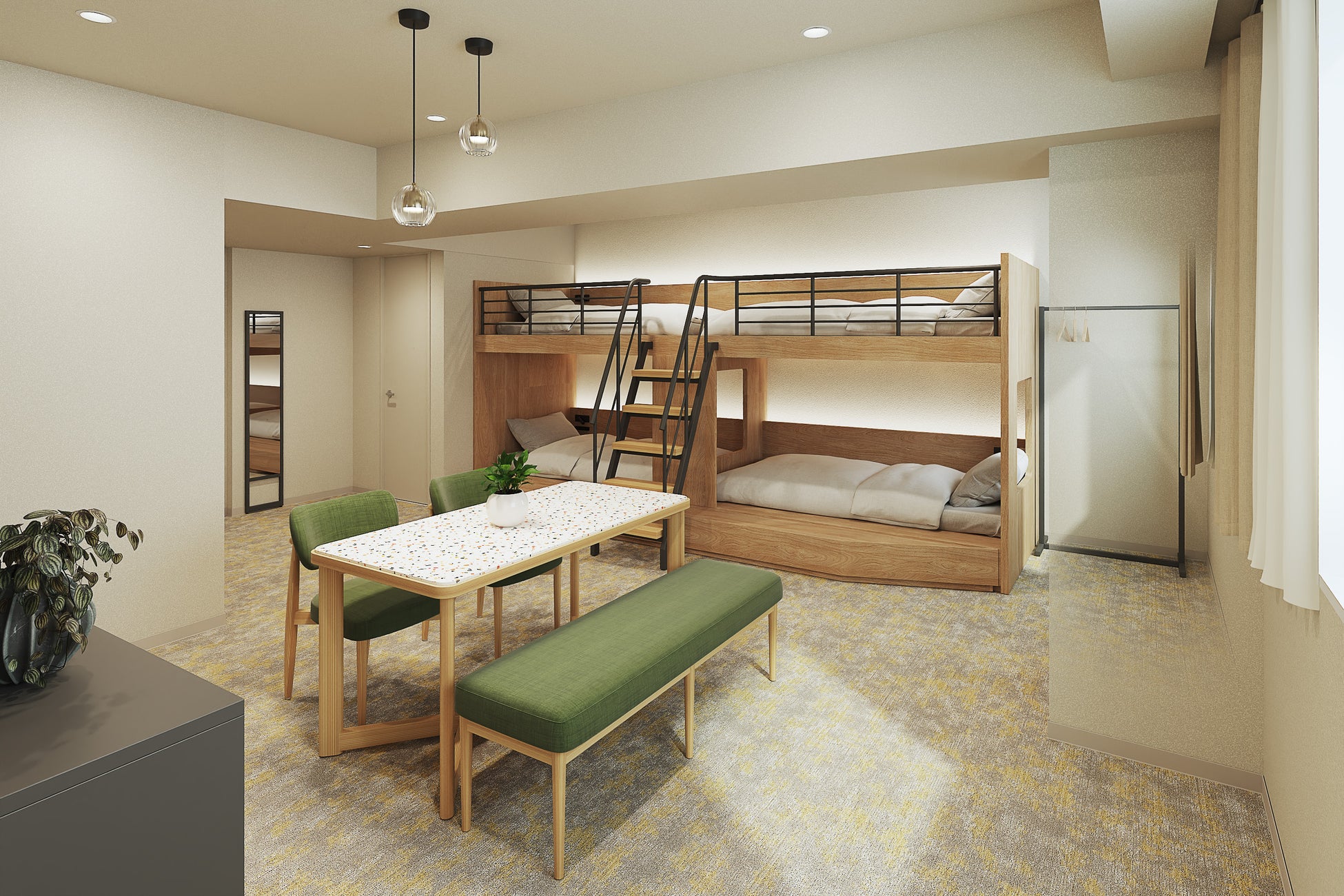 客室は、TVボードに国産杉材を使用した積木パネルを採用するとともに、バンクベッド(2段ベッド)にも杉材を使用しています。最大6名まで宿泊可能なレイアウトとし、一部客室にはミニキッチンや洗濯乾燥機を備えるなど、長期滞在にも対応した機能性を備えています。また、ロビーなどの共用部でも内装にも木材を施し、木に囲まれた山のキャビンで過ごしているかのような空間を演出します。一日の旅の疲れを癒す場所であると同時に、翌日の旅の計画を立てる拠点としてご利用いただけます。