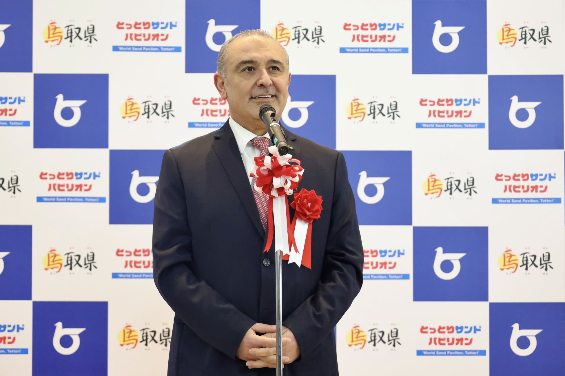 続いて駐日ヨルダン・ハシェミッ ト王国全権特命大使 ナーセル・シュライデ閣下は、「「サンド・アライアンス」はヨルダンと鳥取の友情を記念するもの。ヨルダンと日本は約9,000㎞離れているが、「サンド・アライアンス」の力で2,000㎞縮められると信じたい。」とユーモアを交えつつ、「砂の繋がりだけにとどまらず、ヨルダンと日本という2つの国の人と人の関係が近づくことが大切。さらなる文化的交流をしていきたい。」と挨拶をいただきました。