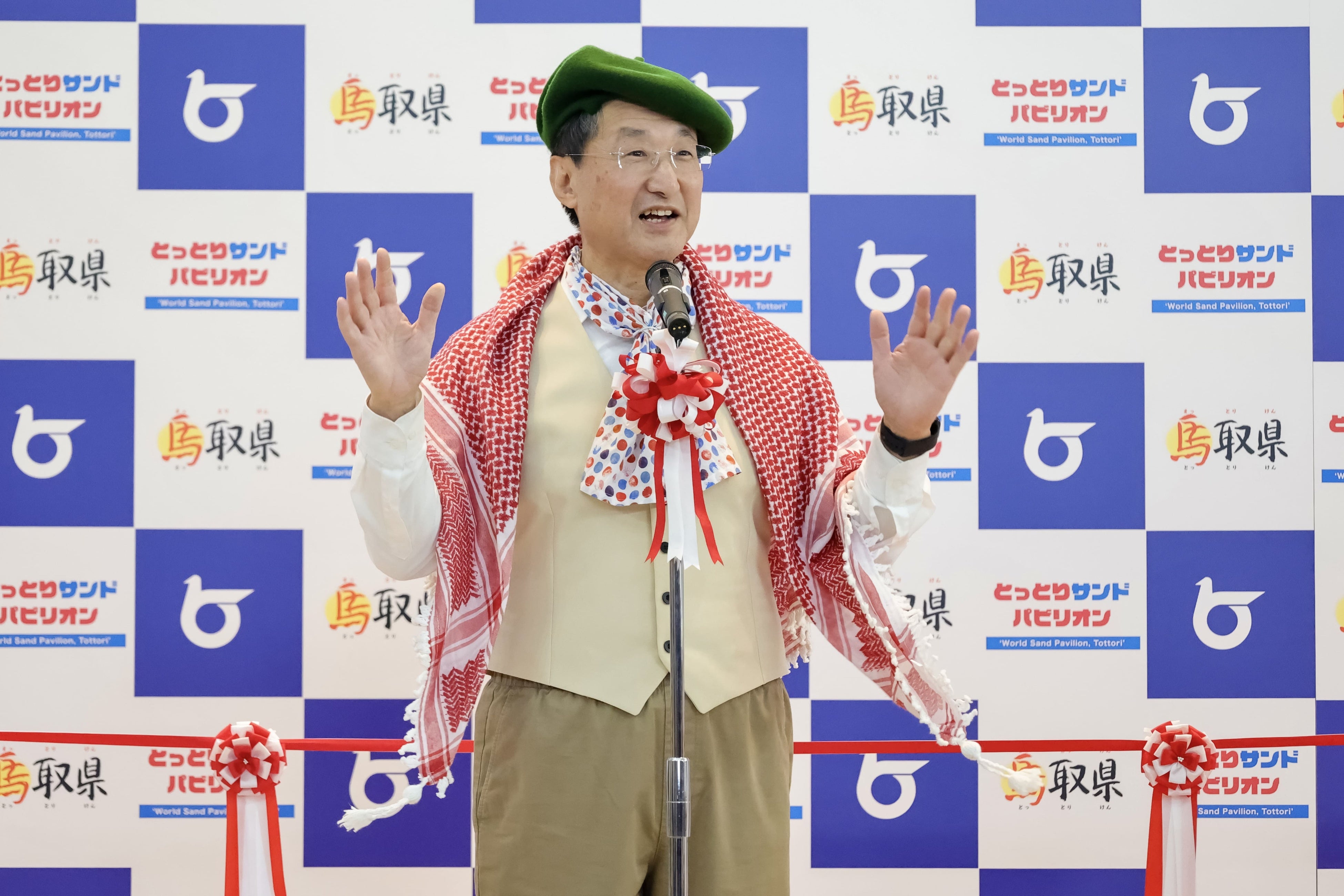 鳥取県ゾーンのアテンダントユニフォームにヨルダンのスカーフを巻いて登場した平井知事は「万博で生まれた「サンド・アライアンス」をきっかけに“とっとりサンドパビリオン”が本日オープンしました。ヨルダン館で大人気だった赤い砂がやってきました。鳥取は万博終わりません。万博ロス界隈の方、大歓迎します!Sooner(=“砂”にかけて) is better。砂に会いに鳥取に来てください!」と開会の挨拶をしました。