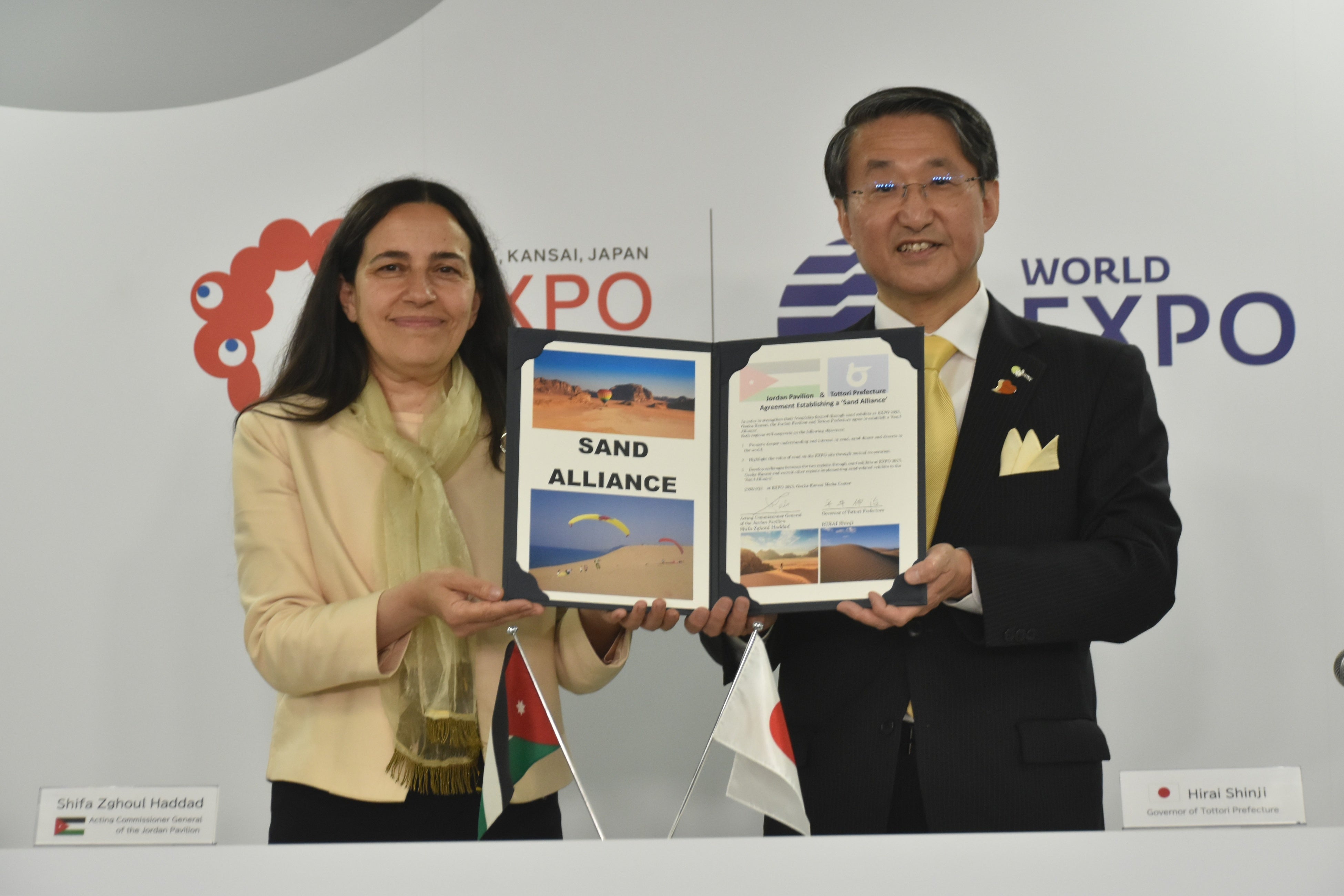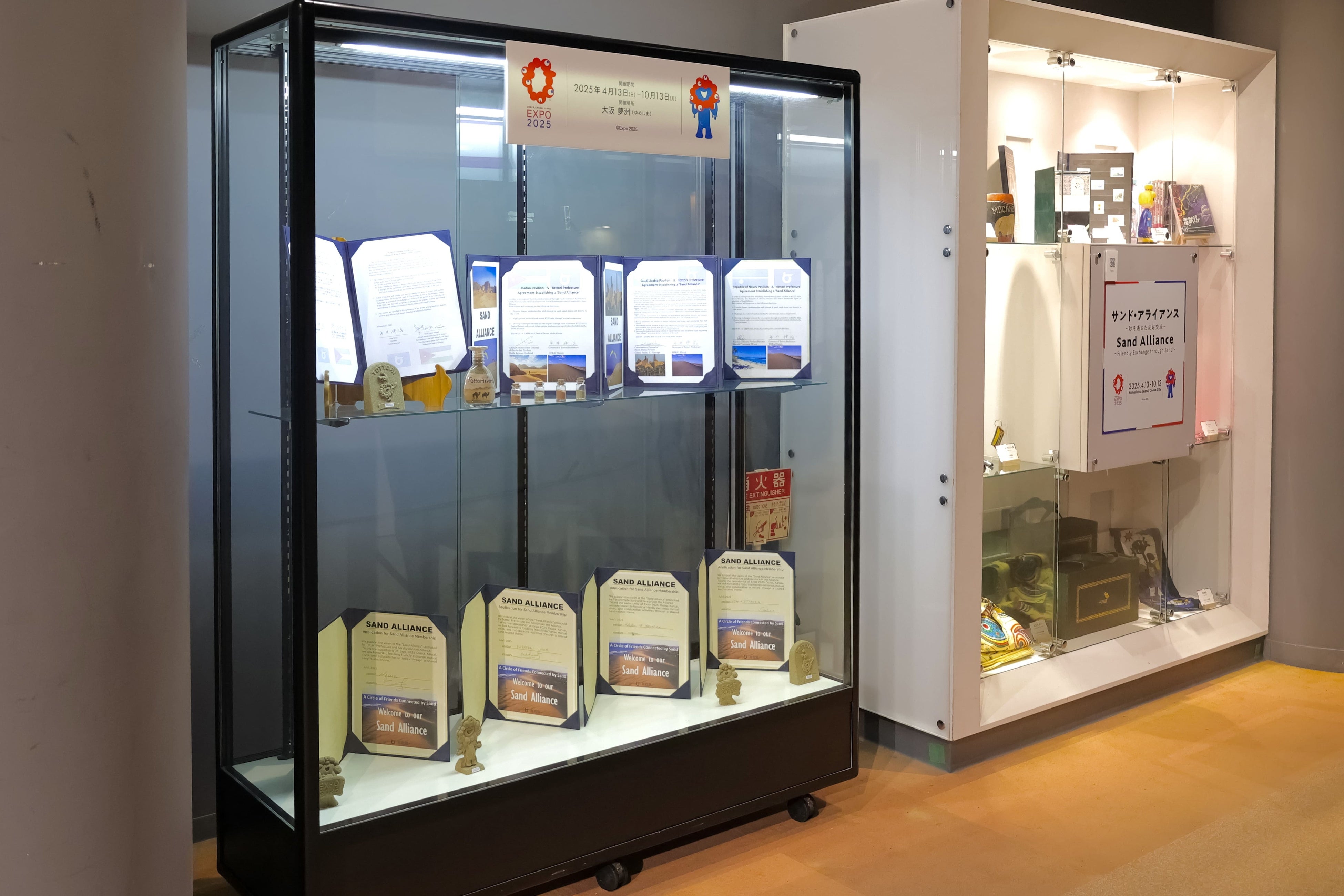鳥取県では、ワディラムの赤い砂を展示するヨルダン館をはじめとする砂に関連する7つのパビリオンとともに「サンド・アライアンス」を結成し、砂で繋がった友好を深めながら、大阪・関西万博を連携して盛り上げる万博外交に取り組み、各パビリオンや本県への訪問を促す「砂ンプラリー(SAND QUEST)」や鳥取砂丘ビジターセンターでの加盟国の紹介を行いました。