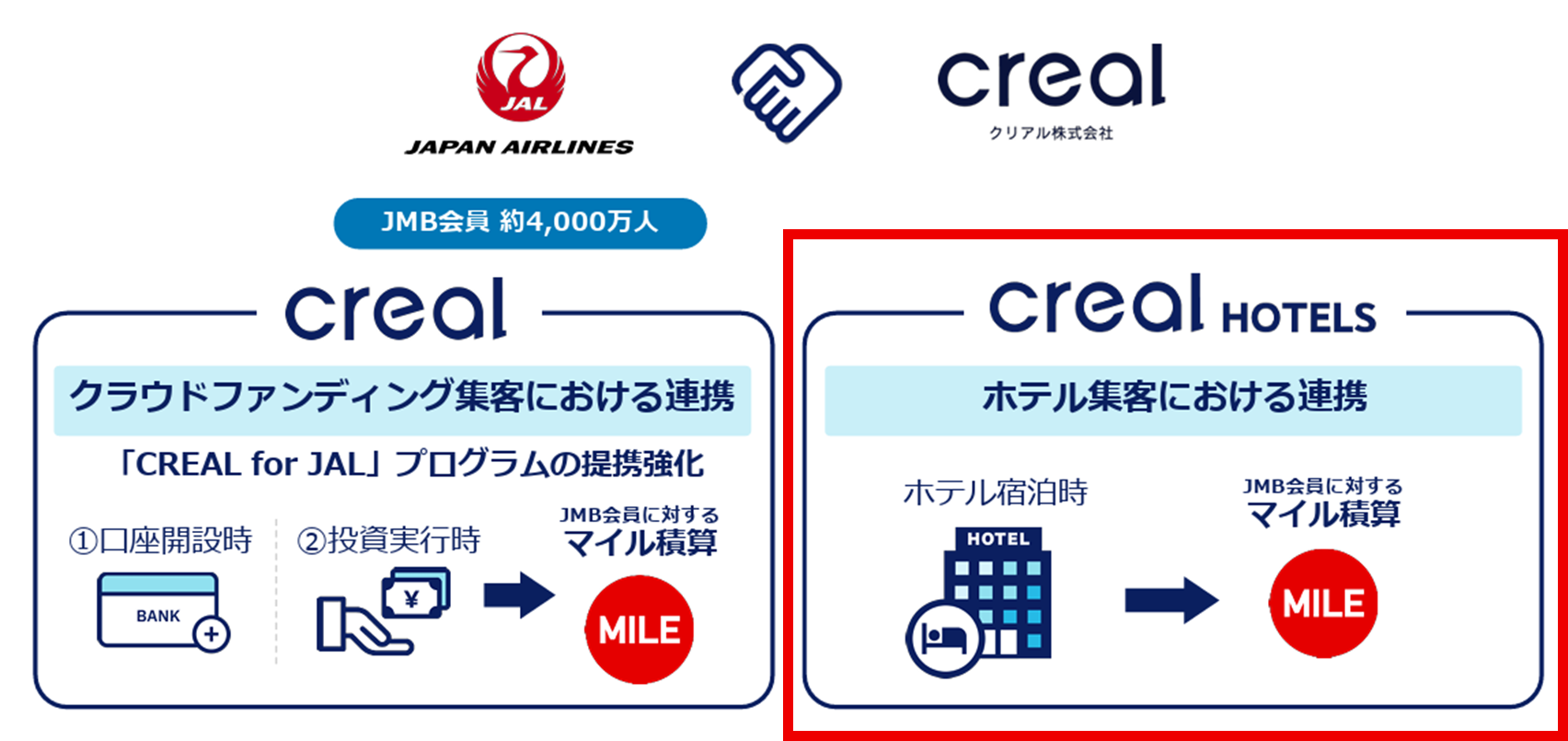 配当先の1社である日本航空株式会社(本社:東京都品川区、代表取締役社長:鳥取 三津子、以下「日本航空」)とは、当社が運営する不動産クラウドファンディングサービス「CREAL(クリアル)」の提携サービスとして、約4,000万人のJALマイレージバンク(JMB)会員の方対象に、投資金額に応じてマイルがたまる「CREAL for JAL」を2020年より展開しておりますが、今回のクリアルホテルズのプログラムは業務提携後の新たな取り組みとなります。