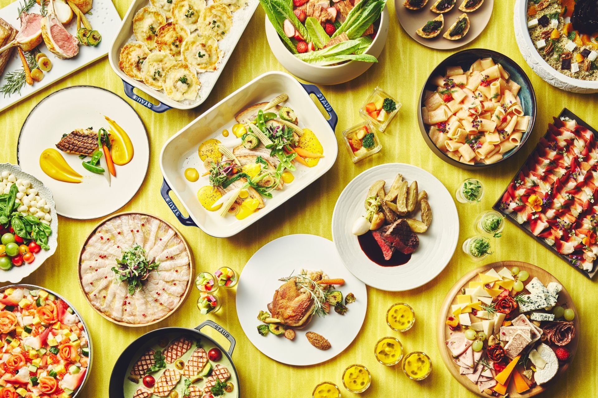 前菜ビュッフェでは、「Bistronomy-Inspired International Cuisine」をテーマに、ブリのカルパッチョや北寄貝と柑橘のサラダ、北海道産ブリーやパルミジャーノ・レッジャーノのチーズセレクション、ストロベリー&モッツァレラのカプレーゼ、ビーフカルパッチョ ヴィテッロトンナート風など、素材の持ち味を生かした冷菜が並びます。さらに、冬野菜のムースやキアヌとビーツ、フェタチーズのサラダ、ほうれん草のキッシュ・ロレーヌ、北海道産野菜とトリュフチーズのフリッターなど、野菜の魅力を引き出した彩り豊かな前菜もご用意。銀鱈と白菜の煮込み、明太子クリームソースのリガトーニ、酒粕とガーリックマヨネーズのシーフードパエリア、ビーフミートボールとイカのトマト煮込みなど、温製メニューも充実しています。