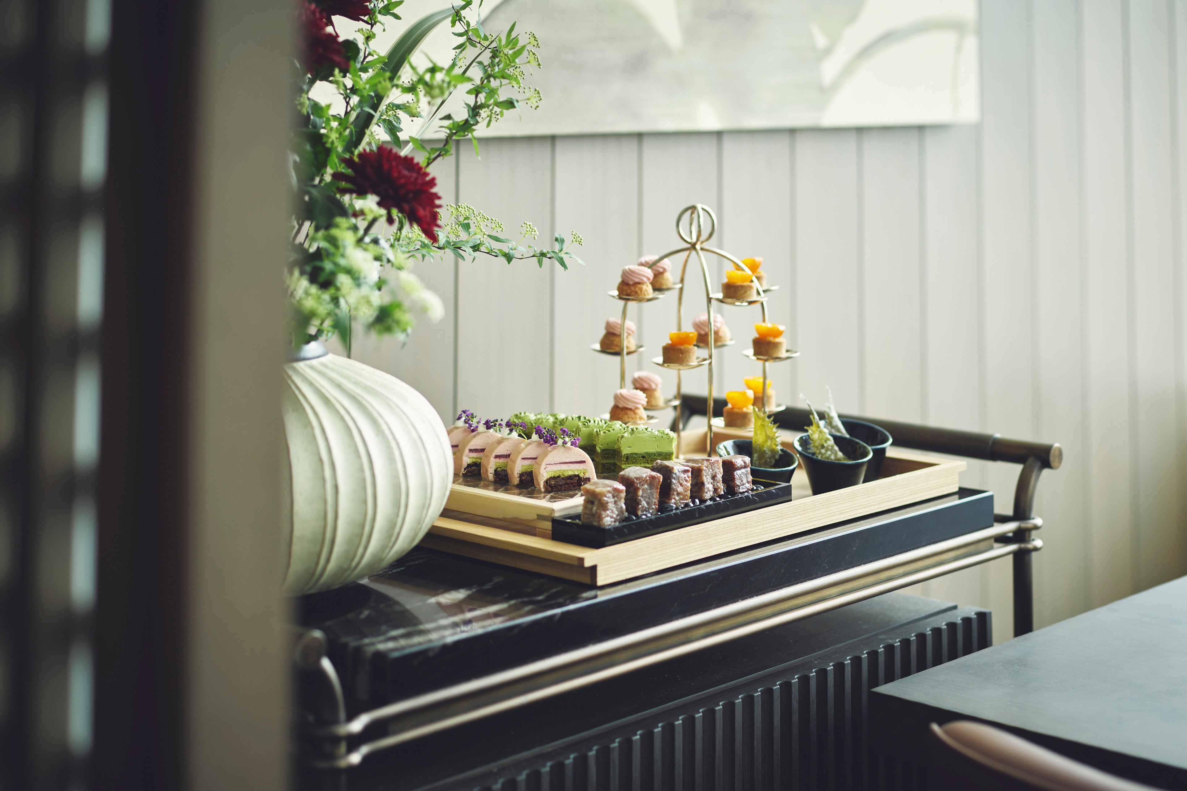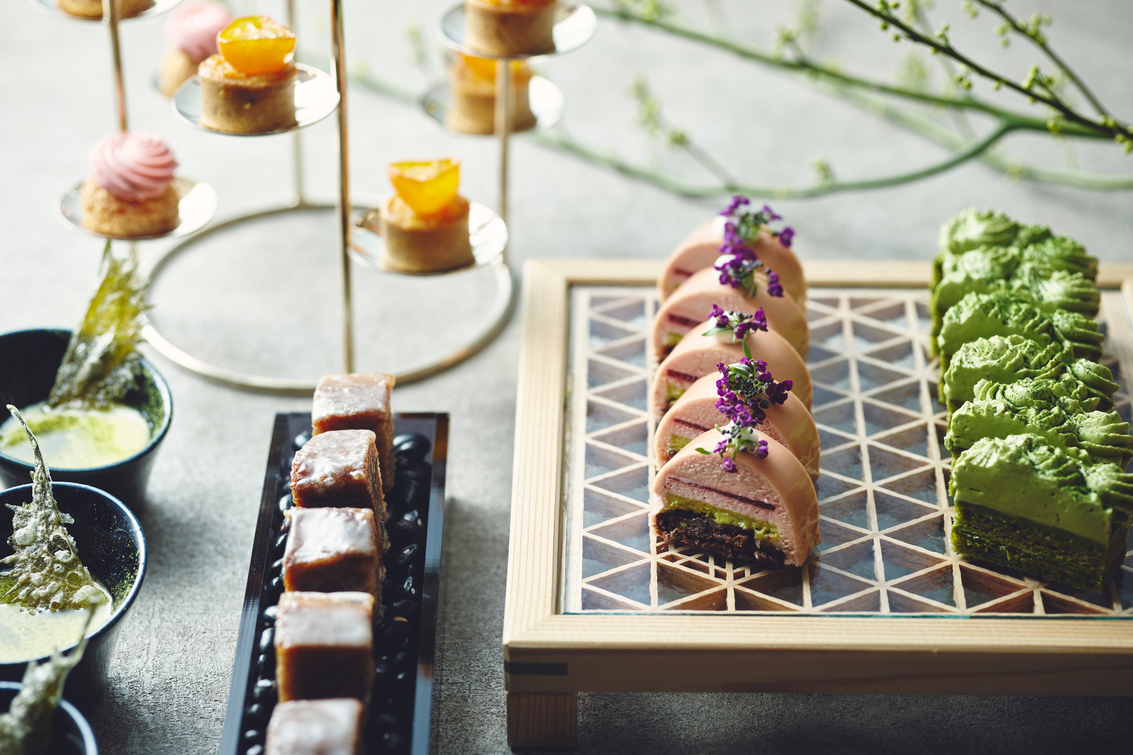 デザートは、季節感と美しさを大切にした数種類のスイーツをワゴンスタイルでご提供。ストロベリーシュー、抹茶シフォンケーキ、小豆パウンドケーキ、金柑タルト、ストロベリーオペラ、抹茶と紫蘇のパンナコッタなどの中から、目の前でご案内しながらお好みのデザートをお選びいただけます。