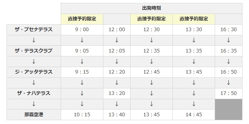 ザ・テラスホテルズでは、ザ・ブセナテラスを含む4つのホテルと那覇空港を結ぶシャトルバス(無料)を運行いたします。沖縄到着後の空港・ホテル間のスムーズな移動で、快適な旅が始まります。