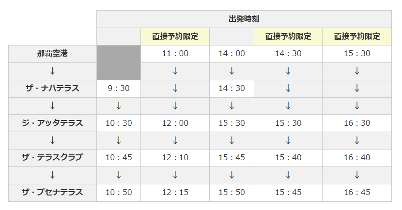 ザ・テラスホテルズでは、ザ・ブセナテラスを含む4つのホテルと那覇空港を結ぶシャトルバス(無料)を運行いたします。沖縄到着後の空港・ホテル間のスムーズな移動で、快適な旅が始まります。