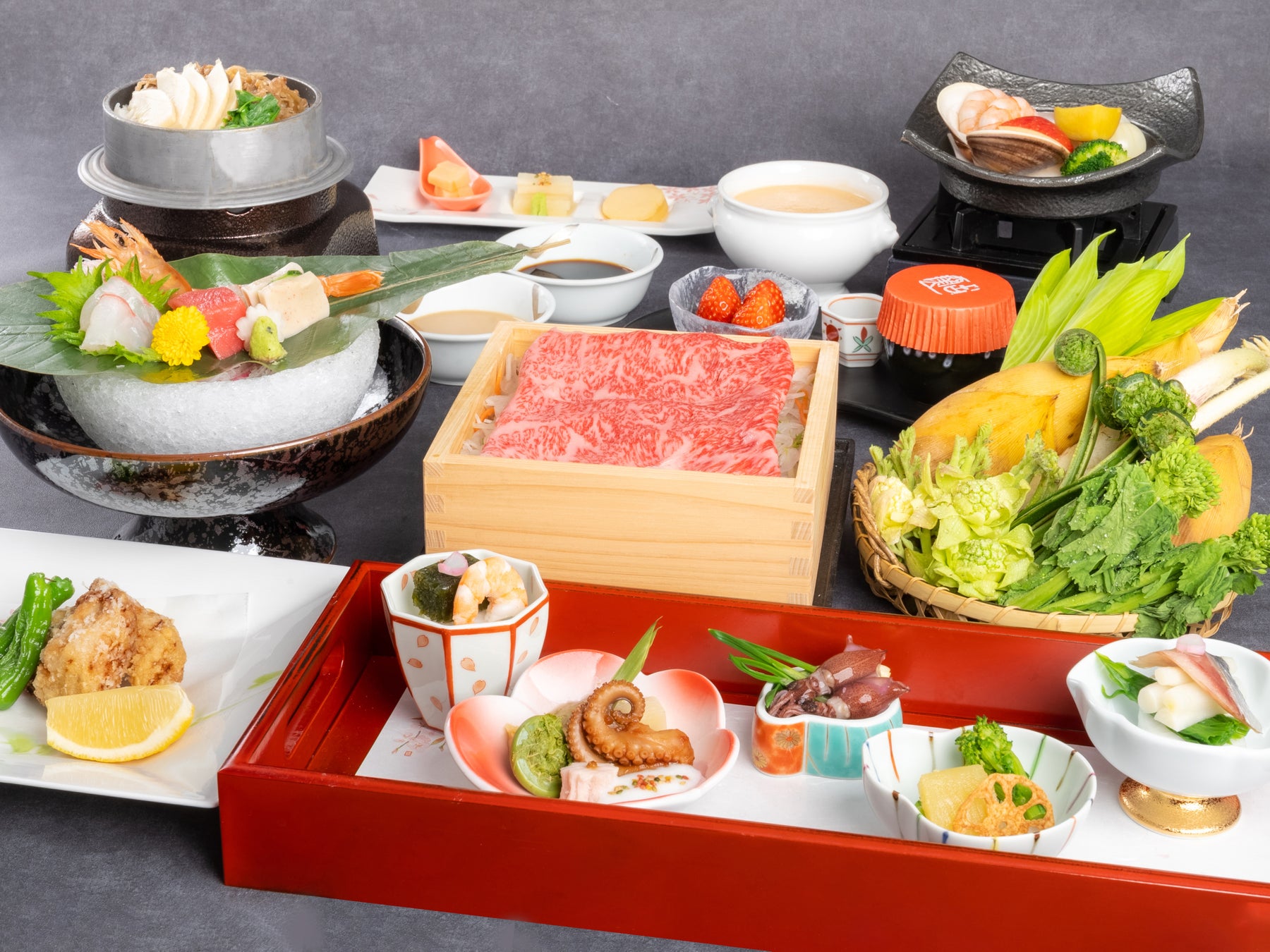 メインは、きめ細やかな霜降りとまろやかな脂質が特徴の地元が銘柄牛「山形牛」。本プランでは、あえて「蒸す」ことで肉の旨味を凝縮させ、山菜のほのかな苦みと香りを引き立てる「温泉蒸ししゃぶ」でご用意いたしました。春会席では、山形県産の山菜と一緒にお召し上がりください。特製ゴマだれとポン酢でお好みで味わっていただけます。