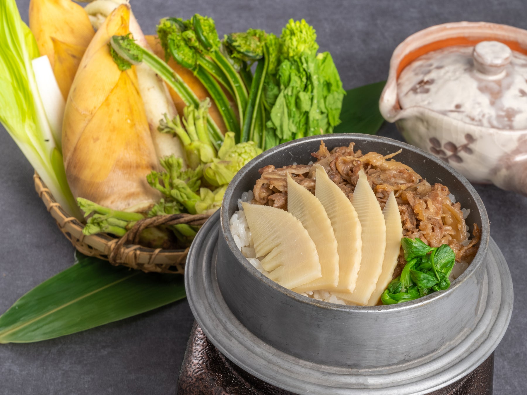 春会席では、古窯の名物料理「牛窯めし」が、春の装いで登場します。炊きたての山形県産「つや姫」に、旬のたけのこと山形牛の旨味を合わせました。まずはそのまま、次に牛しぐれ煮をのせて、最後は特製出汁でひつまぶし風に。山形の豊かな実りを三段階で堪能いただけます。
