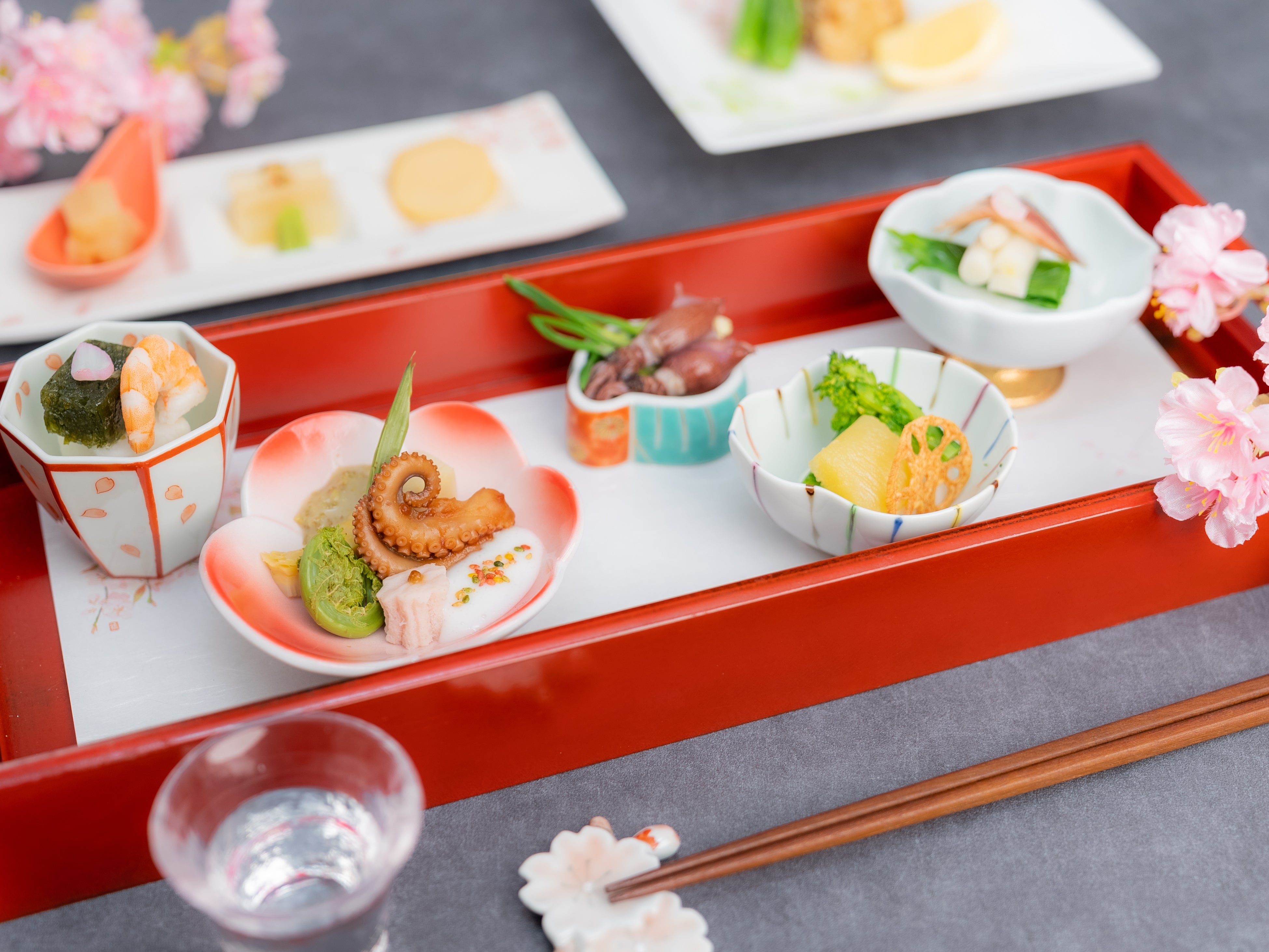 前菜はうるいやこごみなどの山菜や、旬のホタルイカや蛸などの海の幸を贅沢に使用した春らしい彩りの小鉢盛りをご用意。中でも、上山市東地区で守り継がれてきた伝統野菜「小笹うるい」は、農林水産省の地理的表示(GI)保護制度に登録された逸品。一般的なうるいに比べ、茎の白い部分が長く、独特の強いぬめりとシャキシャキとした食感が特徴です。市場に出回る機会の少ないこの希少な山菜を、最も美味しい状態でご提供いたします。