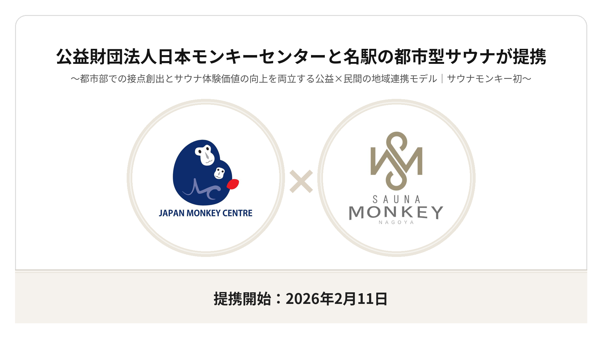 株式会社サウナモンキー(本社:岐阜県岐阜市、代表取締役:伊藤 寛章)が運営する都市型サウナ施設「SAUNA MONKEY / サウナモンキー 名古屋」は、施設開業1周年を迎える節目にあわせ、世界サル類動物園(愛知県犬山市)を運営する公益財団法人日本モンキーセンター(以下、JMC)と提携し、2026年2月11日(水)より、新たな体験型の取り組みを開始いたします。