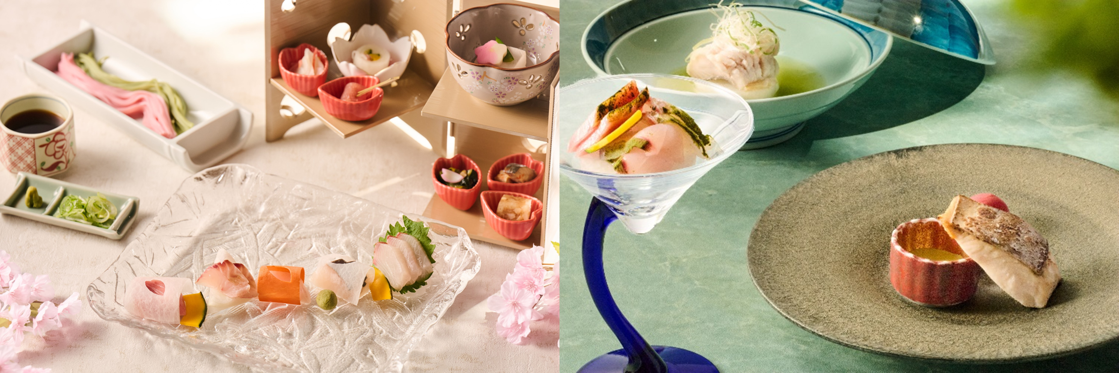 うららかな春に咲き誇る桜と、新緑への移ろいを新茶で表現した本プラン。3月1日~4月7日までの期間は、伊東に咲き誇る桜をテーマに、お花見をイメージした前菜のお花見箱から始まり、舞い散る桜のように盛りつけた旬魚のお造り、桜の葉で麹焼きにした鰆の焼物、桜の香りで蒸した鮑や牛肉、桜の花と葉をイメージした桜二味蕎麦など、目と舌で桜をお楽しみいただく「桜奏でる会席」をご提供いたします。そして4月8日以降は、新緑に染まる伊豆を地元産のお茶を使い、前菜にはお茶会の食事をイメージした華やかな盛り込み皿、昆布締めにしたお茶が香る旬魚のお造り、お茶で仕立てた鮎魚女、伊東を代表するお茶「ぐり茶」を使ったお造りやしゃぶしゃぶなど、新緑に染まる季節を地元産のお茶とともに楽しむ「お茶と新緑が奏でる会席」をご提供いたします。桜咲く春と新緑に染まる春、季節の移り変わりを料理長の豊かな発想で表現された、旬をお楽しみいただく会席料理となっています。