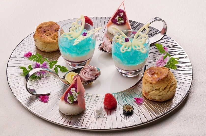 今回は、春限定のイベント期間「el patio」(スペイン語で「中庭」の意味)の開催に合わせ、花園に集まる生き物や、当ホテルのパティオを彩るテラコッタタイルなど、春の景色をモチーフにしたメニューをご用意します。1stプレートには、バラの花や蝶などを模したセイヴォリーを、2nd、3rdプレートには、花の香りに誘われたうさぎをイメージした可愛らしいチョコレートや、ラベンダーの香りを閉じ込めたトリュフなどのスイーツが並びます。