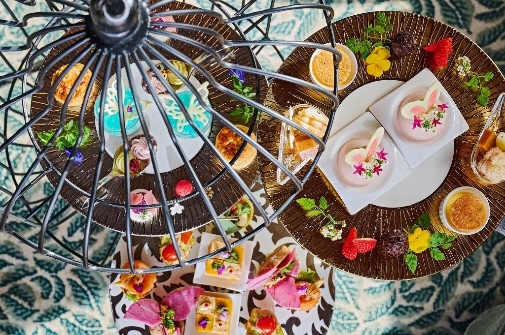 今回は、春限定のイベント期間「el patio」(スペイン語で「中庭」の意味)の開催に合わせ、花園に集まる生き物や、当ホテルのパティオを彩るテラコッタタイルなど、春の景色をモチーフにしたメニューをご用意します。1stプレートには、バラの花や蝶などを模したセイヴォリーを、2nd、3rdプレートには、花の香りに誘われたうさぎをイメージした可愛らしいチョコレートや、ラベンダーの香りを閉じ込めたトリュフなどのスイーツが並びます。
