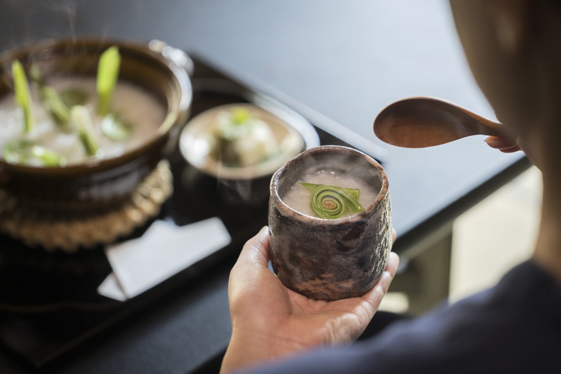 日本鍼灸の施術、アクティビティに加え、食事も陰陽五行のバランスを調える重要な要素です。特に重要なのが、1日目に陽から陰にした状態のまま調整を行う2日目です。その日の朝食は、季節の朝粥を用意します。自身の体調に合わせて自由な時間に起床し、自由な時間に食べることができます。昼食は、五味を網羅した「五行の調律膳」です。「酸味(木)・苦味(火)・甘味(土)・塩味(水)・辛味(金)」のすべてをバランスよく味わうことで、身体を調えます。夕食は、懐石料理です。日本料理はもともと陰陽五行に基づいて理論づけられているため(*3)、そのままでも体質にアプローチすることが期待できますが、さらにその時の体調に合わせて風味を調整して提供します。漢方茶も用意し、身体の調整に繋げます。