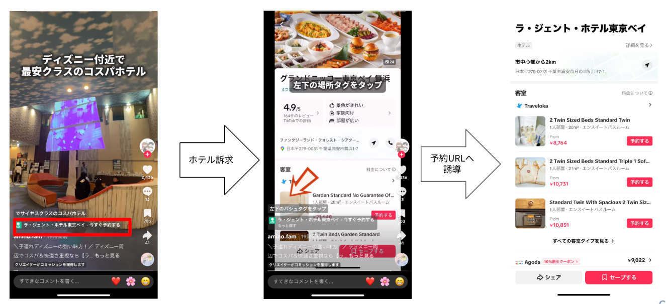 「TikTok GO」は、TikTok上の動画視聴から宿泊・観光体験の検討、予約行動までをシームレスにつなぐ仕組みです。