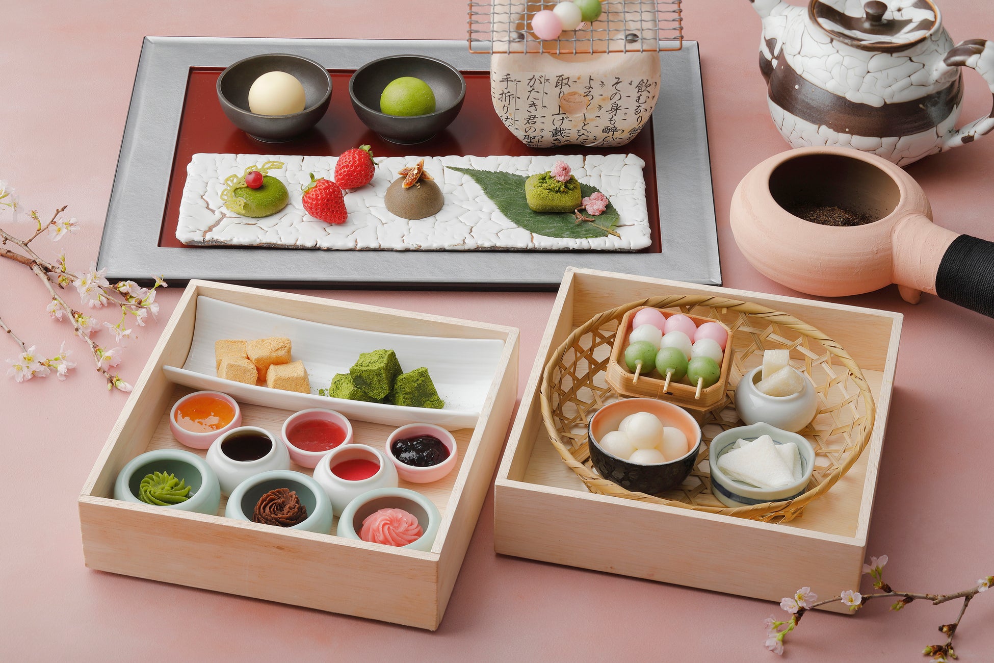春のお花見の季節に寄り添うスイーツボックスは、蓋を開けた瞬間に淡い彩りが花咲くように広がります。三色団子を温めたり、桜や抹茶の餡を重ねたりと、ひと手間ごとに味わいが春の風のように軽やかに変わる体験をお楽しみいただける内容です。見た目にも愛らしい抹茶・ほうじ茶・桜のテリーヌショコラ3種は、なめらかな余韻の中に季節の香りをそっと忍ばせました。いちごの瑞々しさや果実のソースが重なり、和の甘さに彩り豊かな息吹を添えます。香り立つ日本茶とともに、春をゆっくりと愛でるようなひとときをお過ごしください。