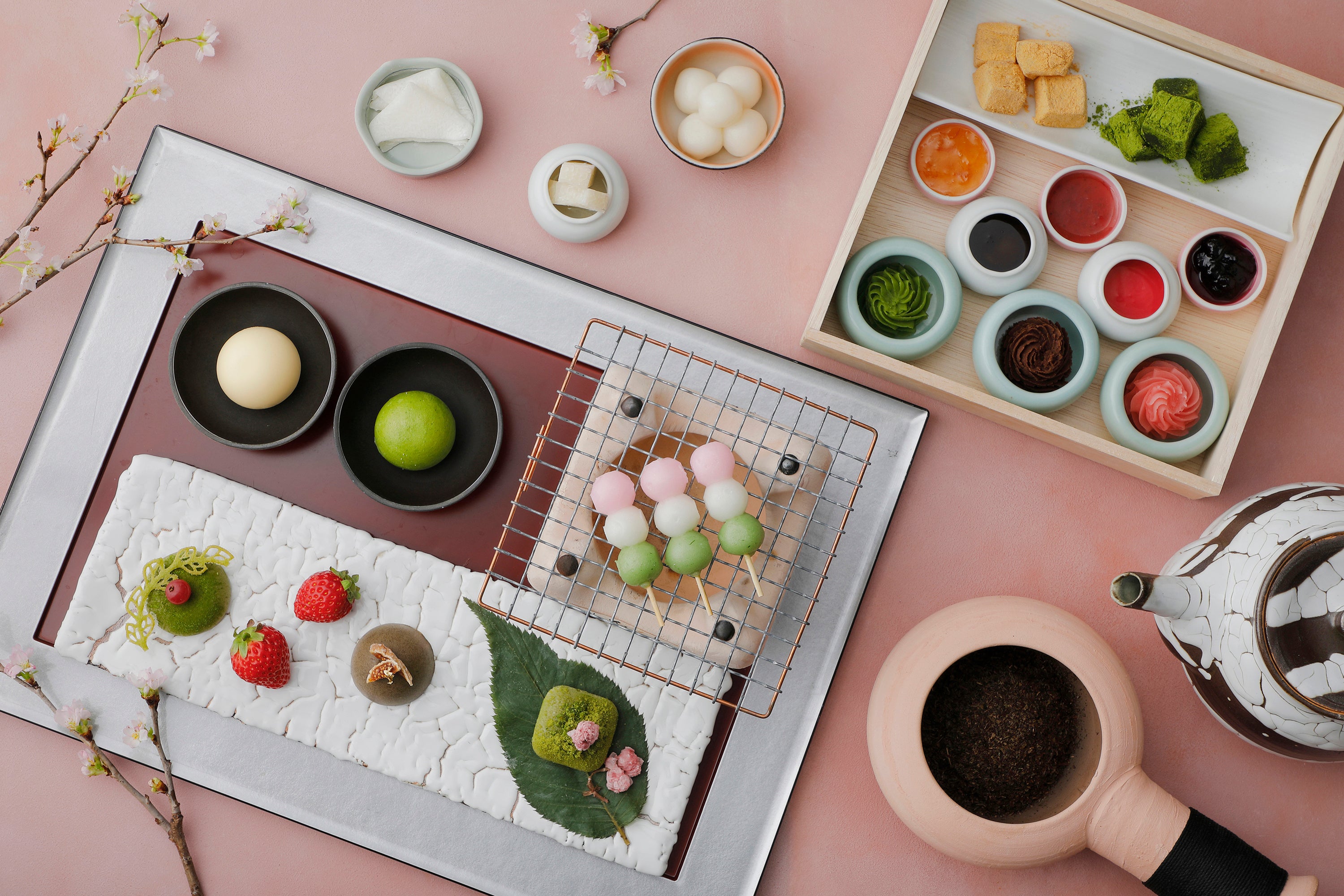 春の訪れを告げる柔らかな色合いをモチーフに、滋賀の素材を取り入れた華やかなスイーツ体験をご用意いたします。「Hanami Dango Sweets Box」では、三色団子や求肥、切り餅など多彩なお餅をご用意し、桜餡や抹茶餡、ジャムやソースなど8種の味をお好みで組み合わせてお楽しみいただけるスタイルで、ほんのり温めた団子に餡を合わせる楽しみや、網で軽く焼き目をつける体験など、自分だけの一品を仕上げる楽しみに出会えます。さらに、抹茶・ほうじ茶・桜の3種のテリーヌショコラが主役となり、春らしい彩りと濃厚な味わいを演出いたします。目の前で煎じる香り豊かなほうじ茶をはじめ、日本茶と紅茶をお選びいただけ、軽やかな甘みと深い香りの余韻をお楽しみいただけます。