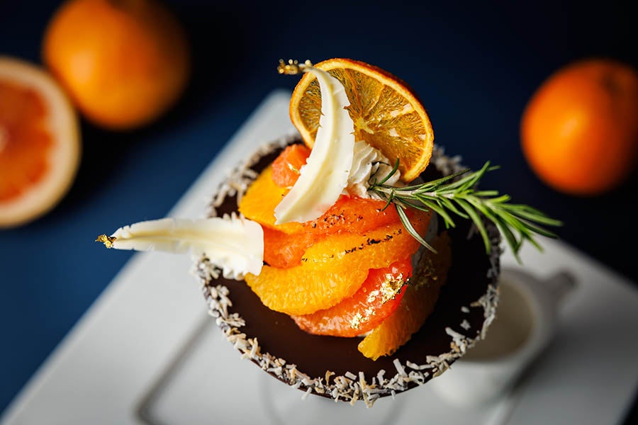 今が旬の柑橘を贅沢に使用した、春の訪れを告げるパフェ。素材の持ち味を活かすのはもちろん、香ばしいキャラメリゼや、ローズマリーと白ワインが華やかに香るコンポートなど、パティシエの技法により柑橘の魅力を多角的に引き出しました。爽やかなジャスミンティーのアイスやゼリーがもたらす清涼感は、柑橘の酸味と相性抜群。さらに、濃厚なココナッツパンナコッタと別添えのソースが織りなす、甘美なマリアージュもお楽しみいただけます。繊細な羽を象ったチョコレートや金箔をあしらった優美なビジュアルなど、細部までこだわりを尽くしました。スプーンを進めるごとに新たな驚きと出会う、この時期だけの贅沢なひとときをご堪能ください。