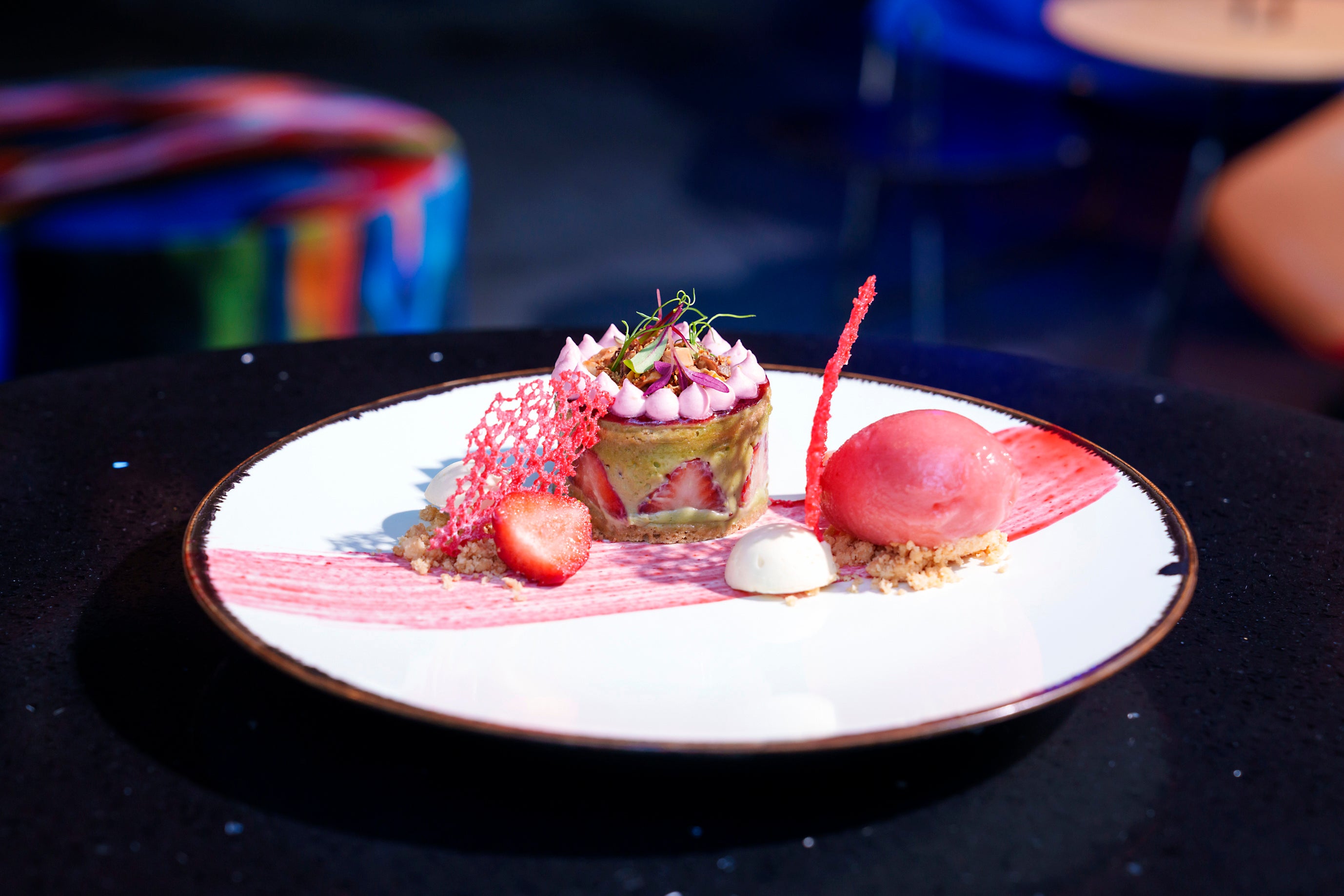 中央に香ばしいプラリネを忍ばせ、いちごの瑞々しさとクリームの軽やかさにほどよいコクを添えています。ひと口ごとに異なるハーモニーが広がる、彩り豊かな一皿です。