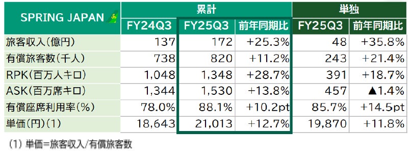 好調なインバウンド需要と緩やかに回復する日本発のビジネス需要を取り込み、Q3単独では旅客数と単価のいずれも堅調に推移しました。
