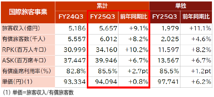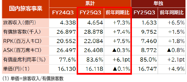 好調なインバウンド需要と緩やかに回復する日本発のビジネス需要を取り込み、Q3単独では旅客数と単価のいずれも堅調に推移しました。