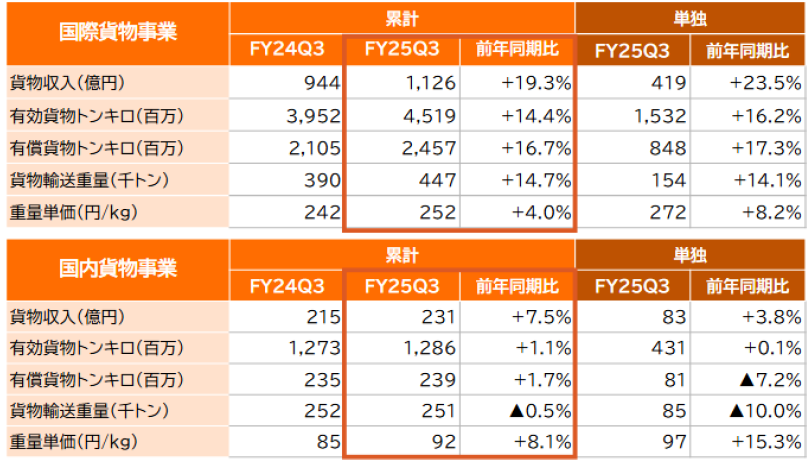 国際線は、成長著しいアジア=北米間の貨物需要を獲得し、前年比+19.3%の増収となりました。