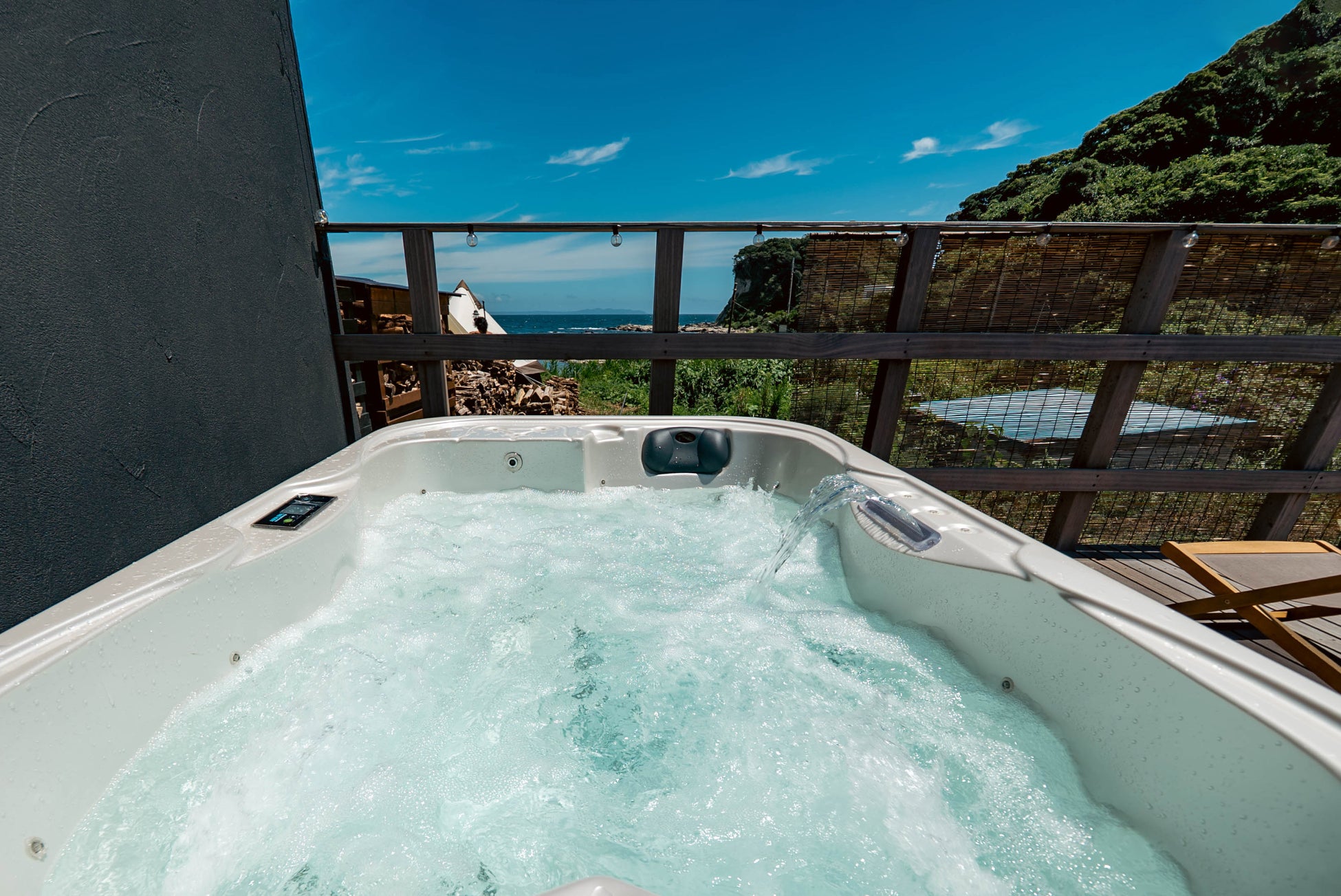 プライベートサウナに隣接して、全棟に温水ジャグジーをご用意。目の前に広がるオーシャンビューを眺めながら湯に身を委ねるひとときは、まるで海外リゾートのような非日常感を演出します。夏は海風を感じながらリゾート気分を満喫し、冬は温かな湯に包まれながら星空と波音に癒される贅沢な時間を。
