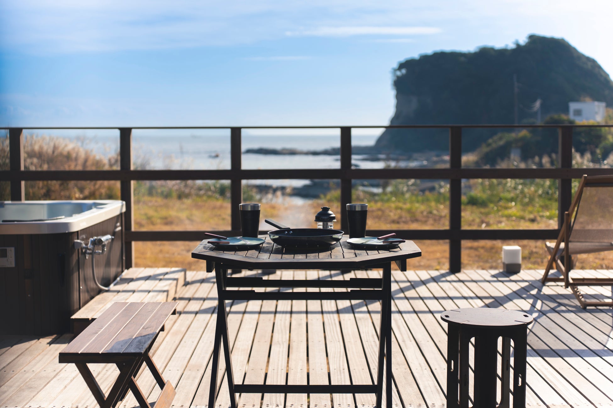 全棟にプライベートサウナと水風呂を完備。海沿いのウッドデッキで楽しむ外気浴では、目の前に広がる太平洋と心地よい海風を全身で感じながら、ここでしか味わえない“ととのい”の時間をご体感いただけます。完全プライベート仕様のため、人目を気にせず自分たちのペースで楽しめるのも魅力。