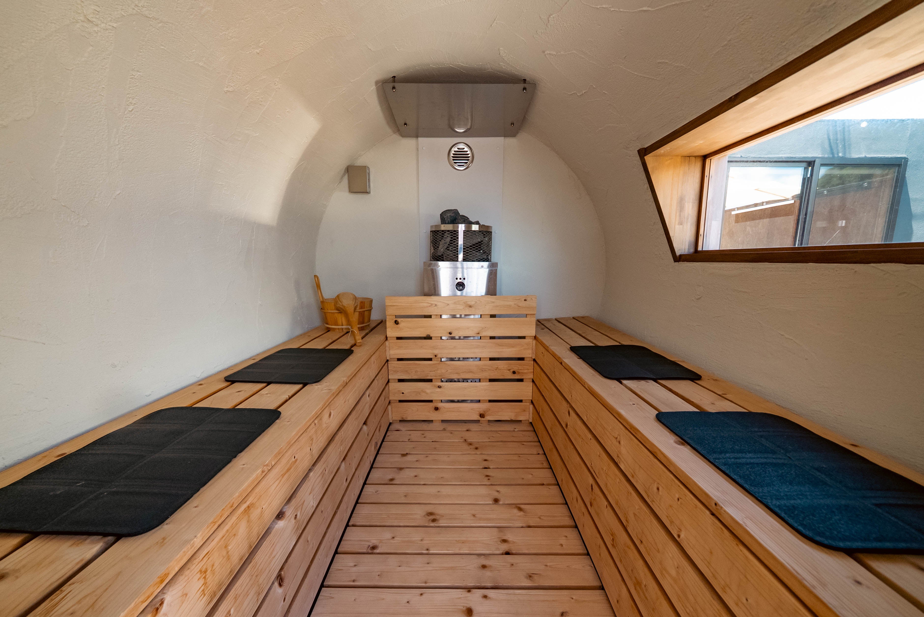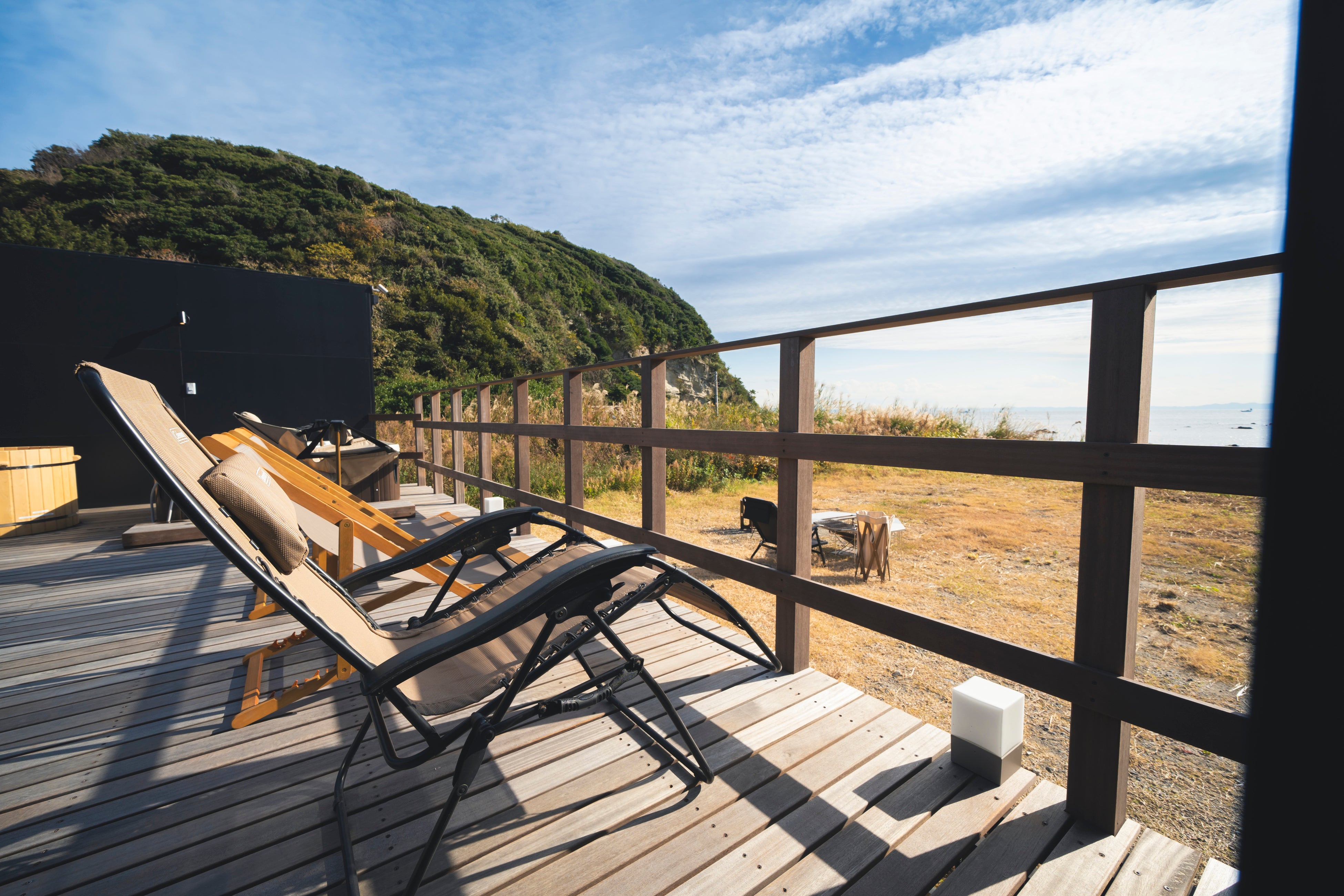 全棟にプライベートサウナと水風呂を完備。海沿いのウッドデッキで楽しむ外気浴では、目の前に広がる太平洋と心地よい海風を全身で感じながら、ここでしか味わえない“ととのい”の時間をご体感いただけます。完全プライベート仕様のため、人目を気にせず自分たちのペースで楽しめるのも魅力。