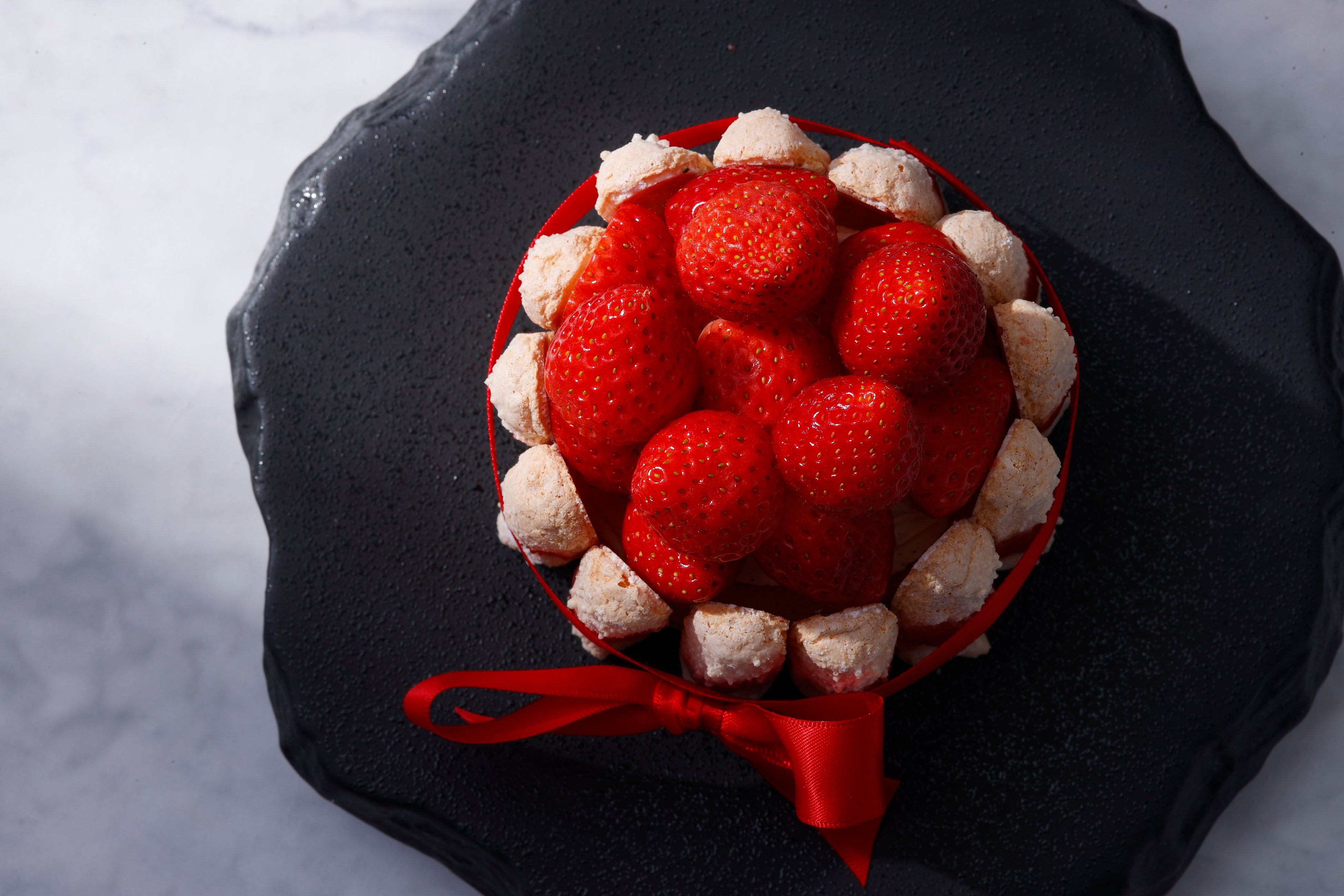このケーキは、フランスの伝統菓子「シャルロット」をベースに、素材の個性と構成にこだわって仕立てた、ホワイトデー限定商品です。内側には、ダコワーズ生地を土台に、バニラビーンズを使用したクリームを重ね、その中心にいちごのジュレを忍ばせました。華やかでフローラルな香りが特徴のバニラビーンズが、いちごの酸味をやさしく包み込み、上下に配したダコワーズが食感に心地よいリズムを、仕上げにあしらったフレッシュないちごが、味わい全体に果実感と華やぎをもたらします。周囲のビスキュイは、構成全体を穏やかに支えながら、クラシカルで洗練された佇まいを演出。素材それぞれの個性が静かに引き立ち、後味に品のある余韻を残します。