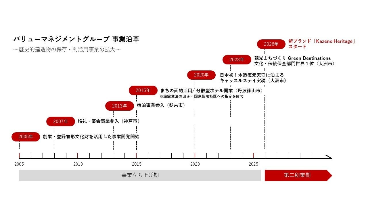 バリューマネジメントグループは「文化を紡ぐ」をパーパスに掲げ、税金に依存しない歴史的建造物の保存・利活用モデルを構築することで、持続可能なまちづくりと文化継承の実現を目指しています。 2005年の創業以来、城郭・史跡・文化財などの「観る」対象であった歴史的資源を、ホテルやレストラン、ユニークベニューとして「必要とされ」「活用できる」場へと転換。2015年には地域全体をホテルと見立てる「分散型ホテル」を、2020年には日本初の「キャッスルステイ(城泊)」を開始するなど、革新的な事業モデルを社会実装してまいりました。 2026年2月現在、当グループとして、保存・利活用する歴史的建造物の棟数は現在までに115棟にのぼります。さらに2026年より、顧客にとっての旅行の在り方を「消費活動」から「回復と再生のための滞在」へと進化させるべく新ブランドシリーズ「Kazeno Heritage」を始動。文化財の保存と経済活性化の両立を目指し、地域資源を未来へつなぐ事業展開を加速してまいります。