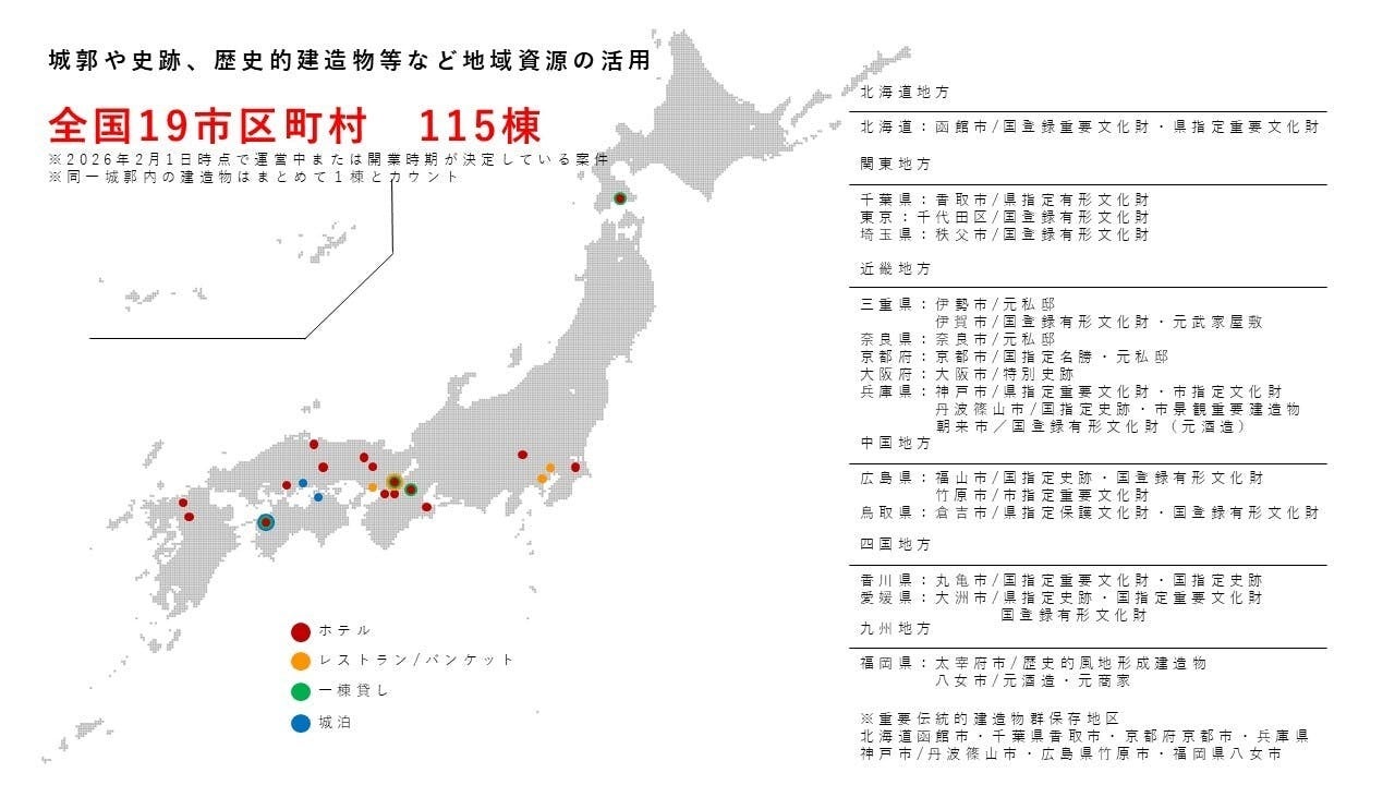 私たちは2005年に創業後、2008年より登録有形文化財を活用した事業モデルの検証を行い、2013年に歴史的建造物を活用したホテル運営を開始。2015年には国家戦略特区に選定された兵庫県篠山市にて分散型ホテルを事業化、2020年には日本初のキャッスルステイ(城泊)を開始するなど、観光まちづくりの事業モデルを常に進化させてまいりました。2026年2月現在、当グループとして建物を保存し、ホテル等に利活用している歴史的建造物は115棟、全国19市区町村に上ります。