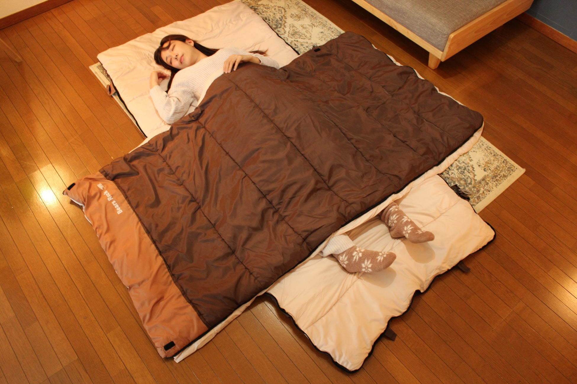 敷いて、掛けて、包まれる構造なので、床からの冷えやすい避難先でも、布団に包まれるような安心感があります。