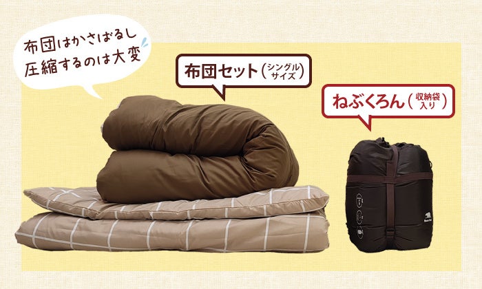 ねぶくろんは、付属の「しろくまん圧縮袋」で収納することで、一般的な布団と比べてコンパクトに備えておくことができます。
