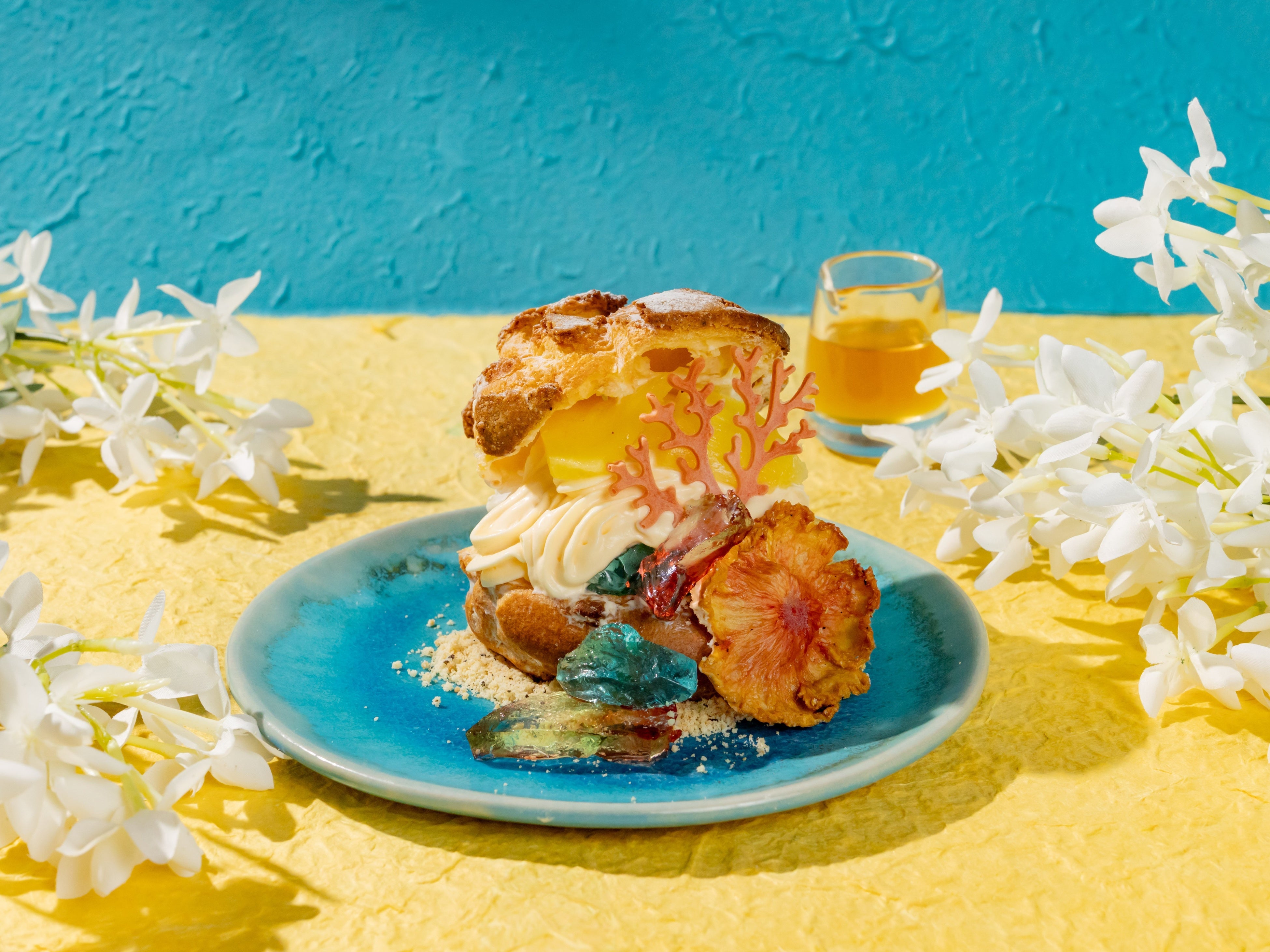 海の中の岩礁をイメージした一皿の上には、南国に咲く花に見立てたドライパインや、白い砂浜のように散りばめたクッキーの粒、そしてシーグラスに見立てた涼やかな琥珀糖をあしらいました。シュー生地のザクザク感に、口の中でふわっと溶けるアイス、琥珀糖のガリッとした小気味よい食感が重なり、一口ごとに新しい驚きが広がります。お好みでさんぴんシロップをかければ、華やかな香りがより一層際立ち、さらにお楽しみいただけます。
